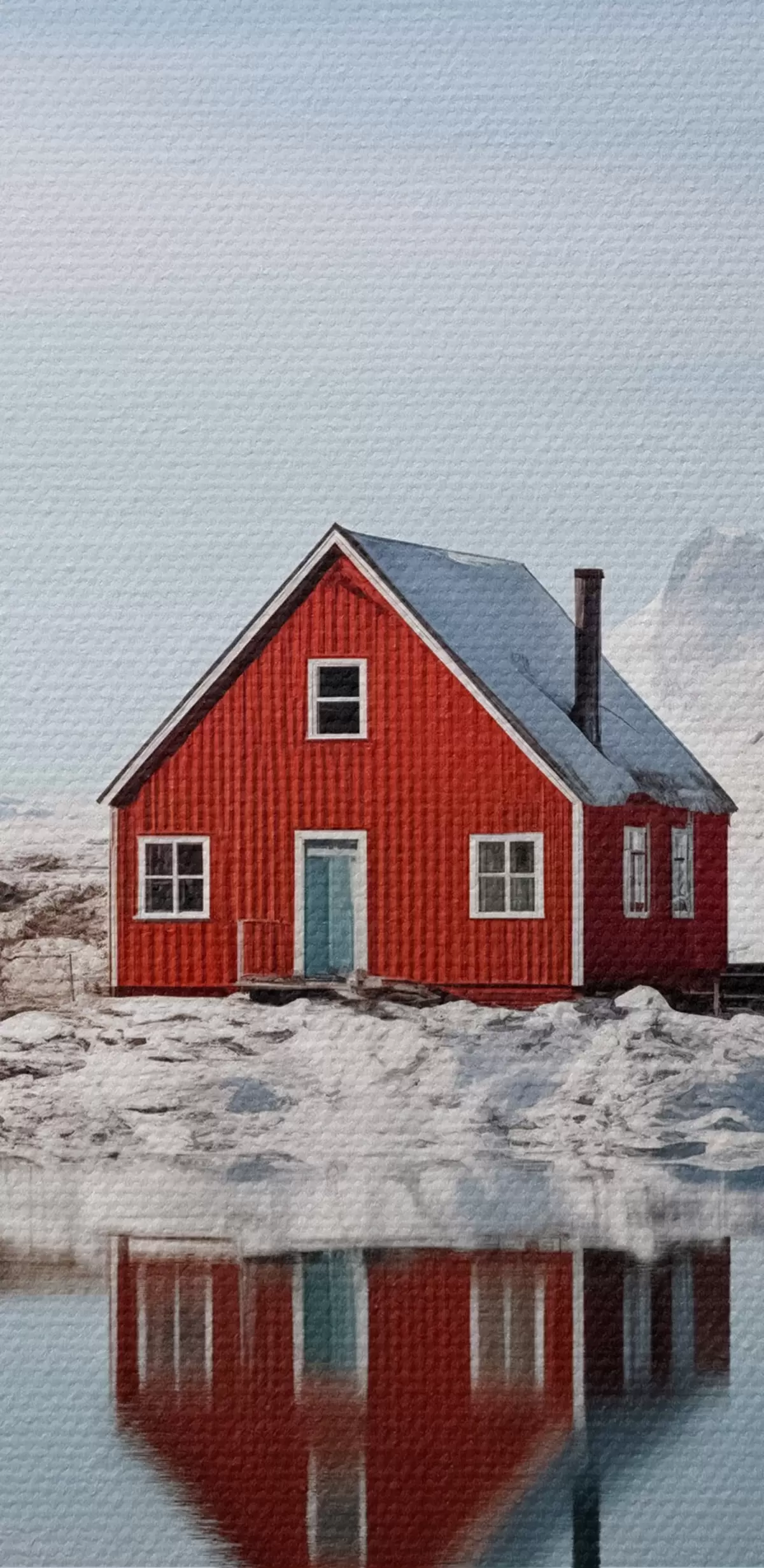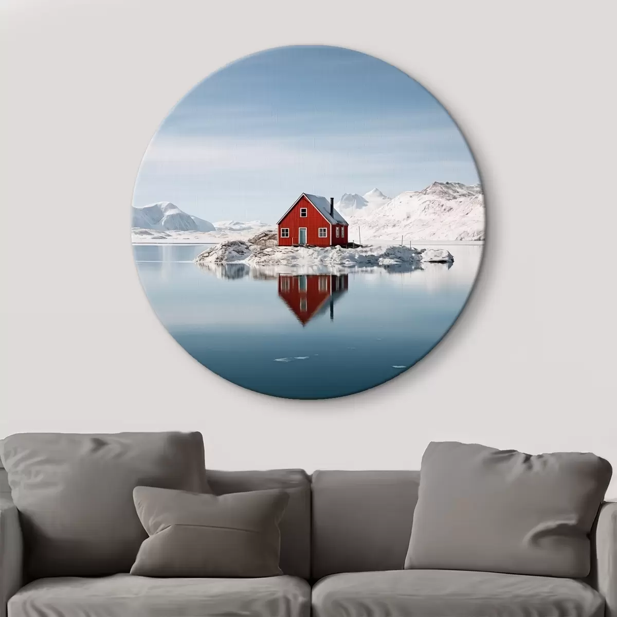 Tableaux rondes Paysage hivernal minimaliste maison rouge au bord du lac Nr r41437