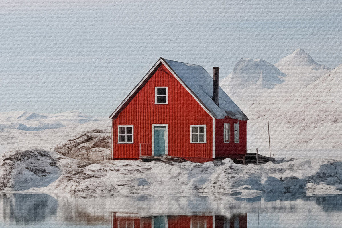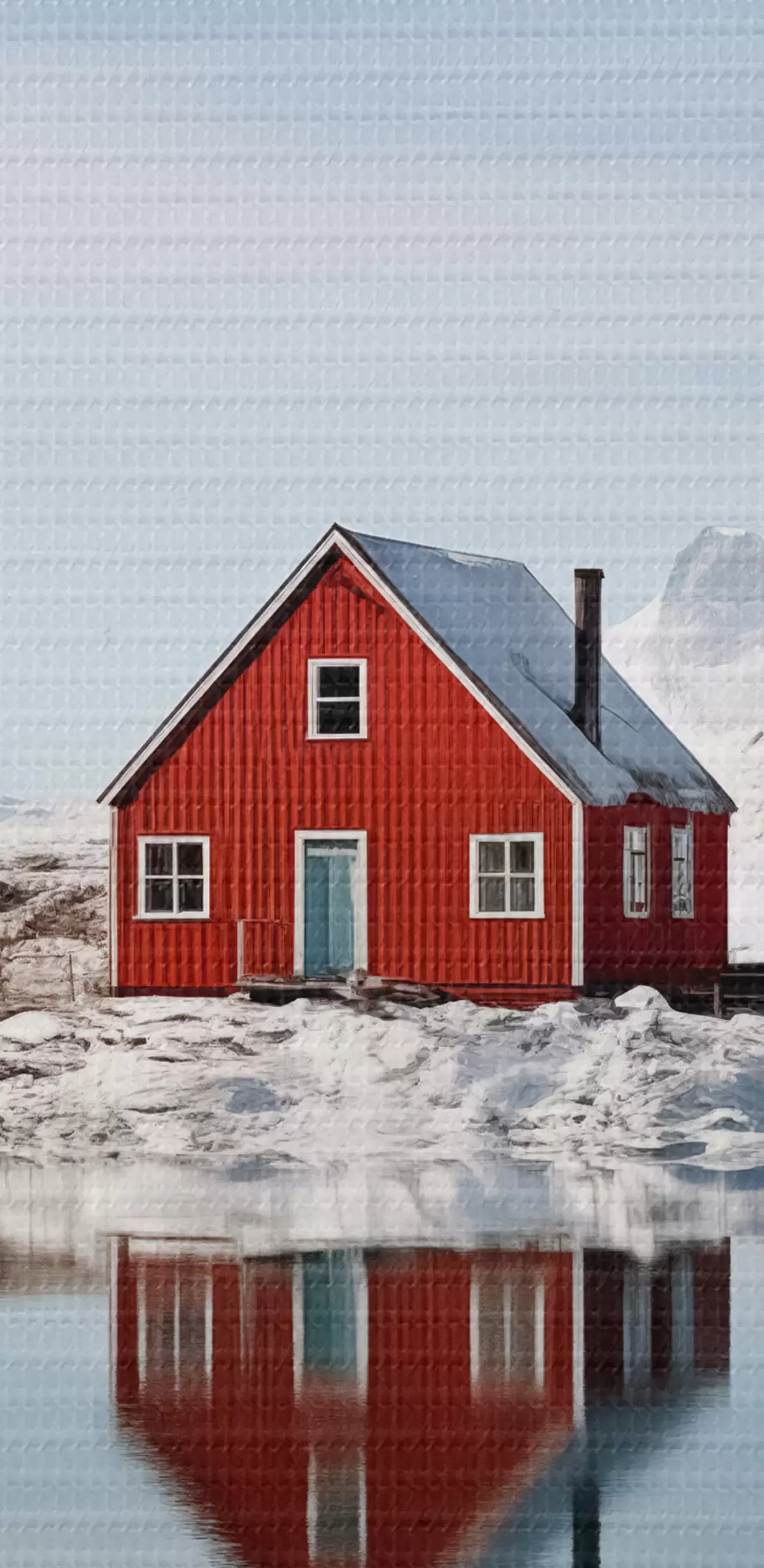 Tableaux rondes Paysage hivernal minimaliste maison rouge au bord du lac r41437