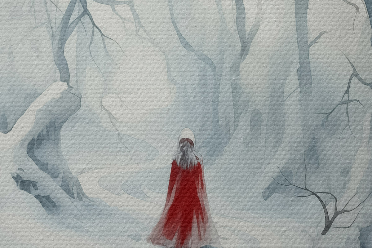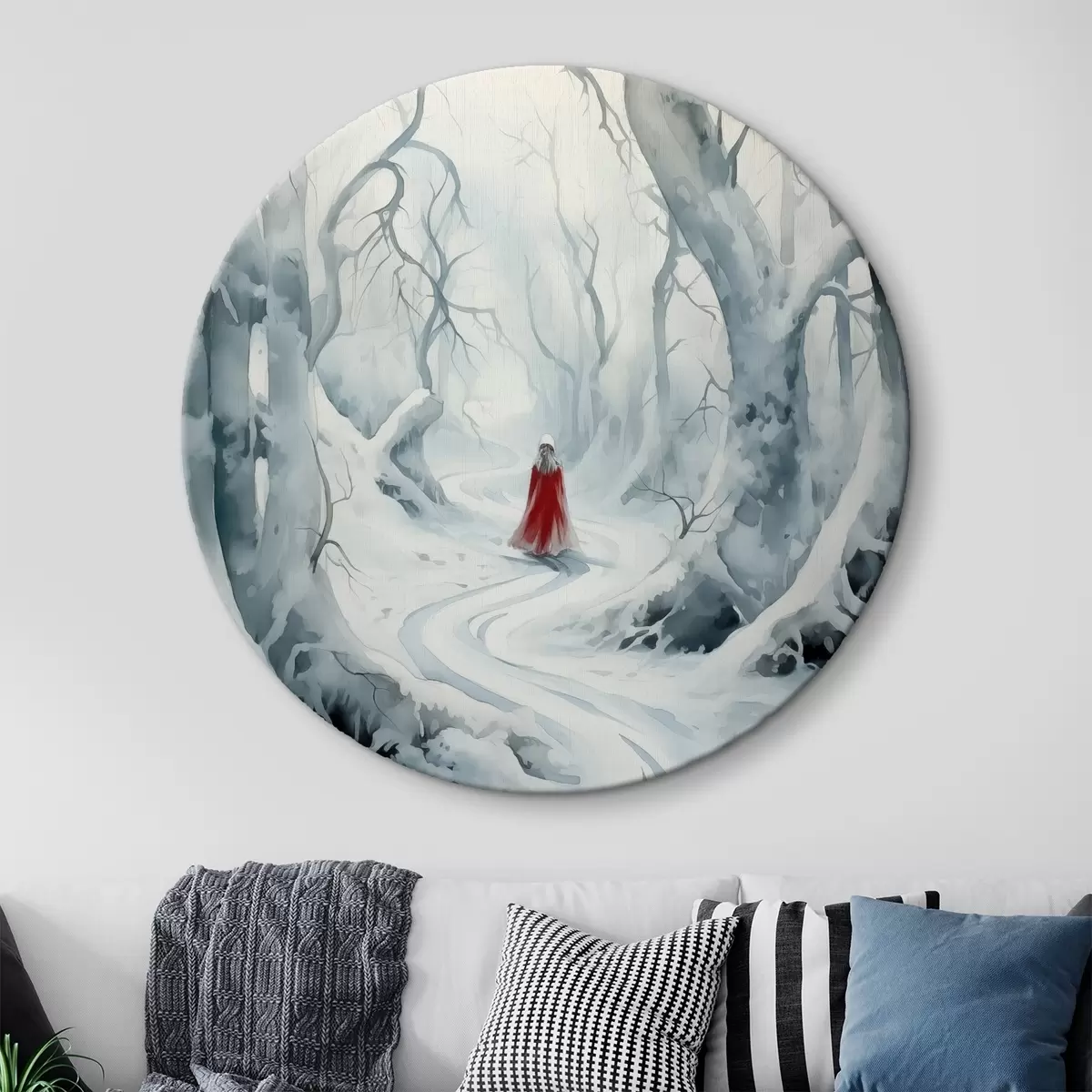 Tableaux rondes Un homme en manteau rouge au milieu d'une forêt hivernale r41438
