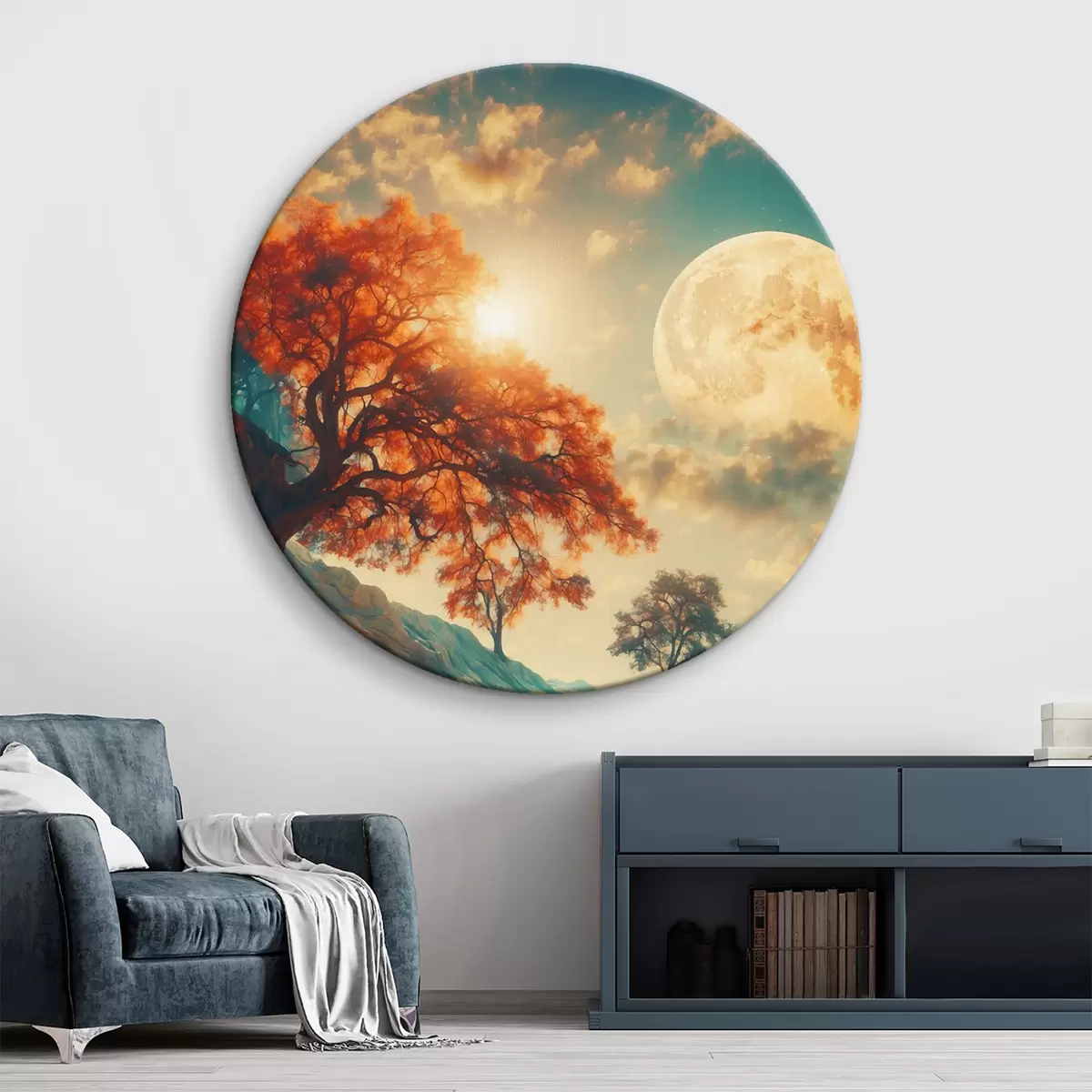 Tableaux rondes Arbres et montagnes sur fond de grande lune Nr r41774