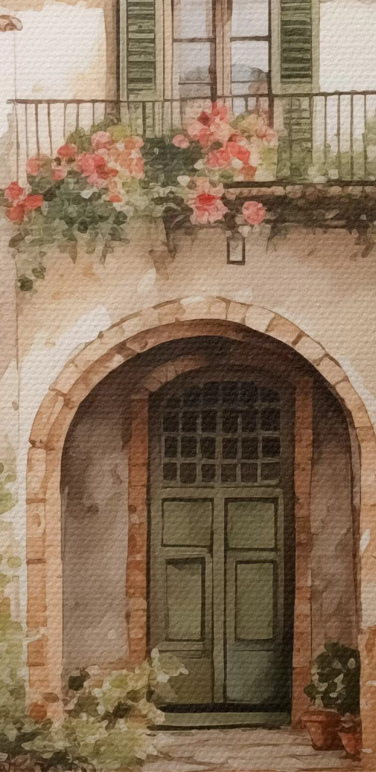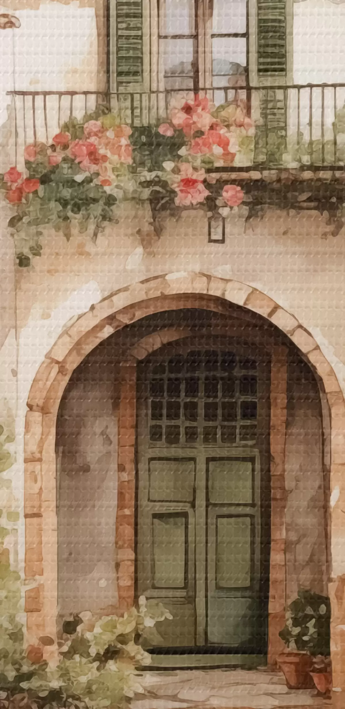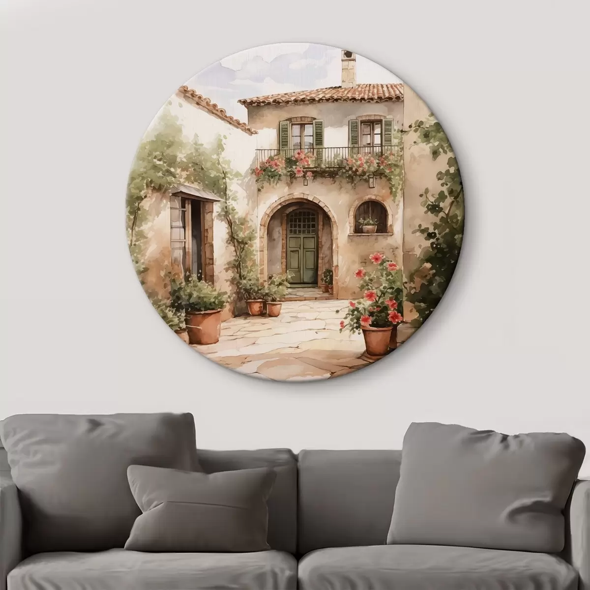 Tableaux rondes Cour italienne avec pots de fleurs imitation aquarelle Nr r42126