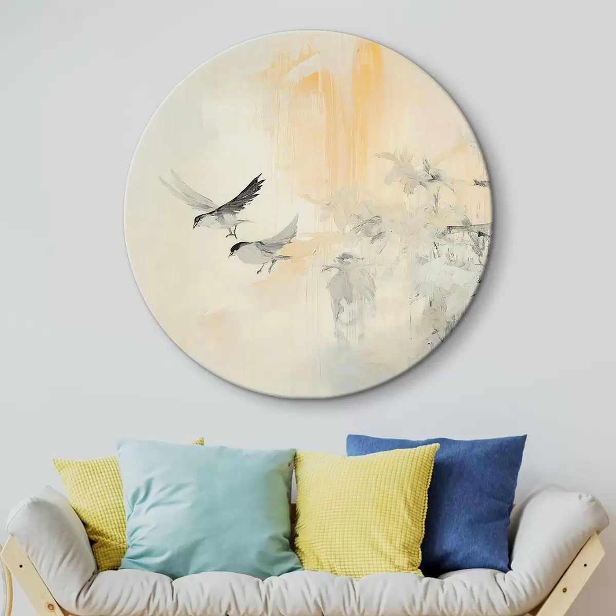 Tableaux rondes Abstraction avec oiseaux, style acrylique, couleurs grises et beiges r42206