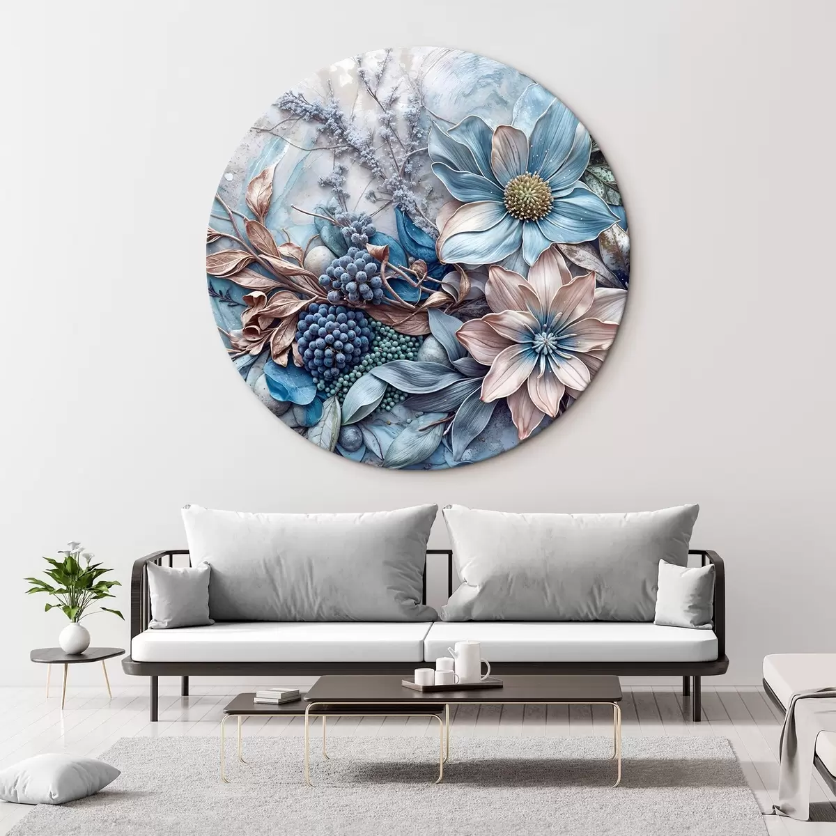 Tableaux rondes Une fleur luxuriante abstraite texturée et détaillée avec de grandes fleurs bleues et roses vibrantes, des baies et d'autres éléments botaniques Nr r42210