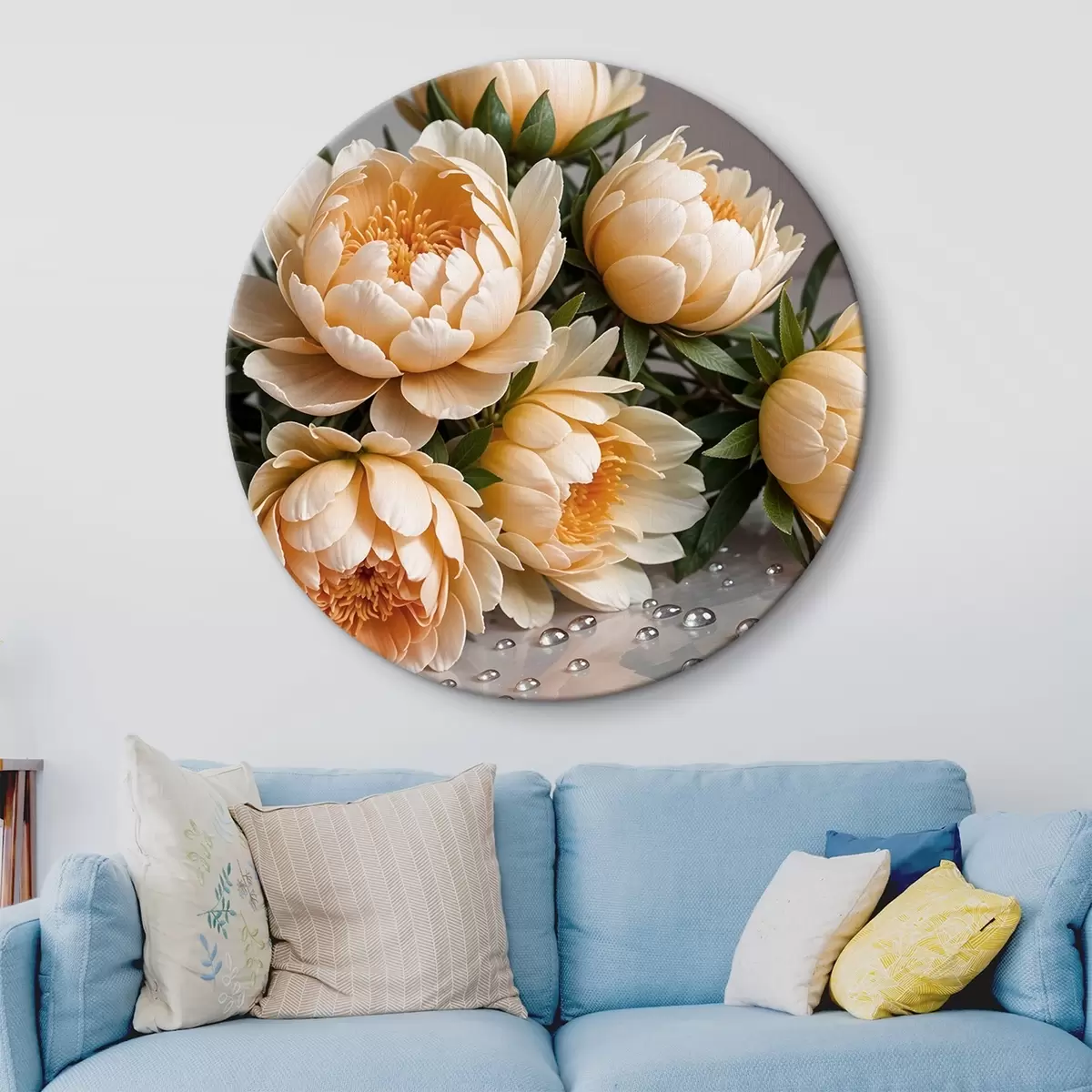 Tableaux rondes Fleurs de pivoines détaillées de couleur crème avec des feuilles vertes foncées sur un fond gris Nr r42215