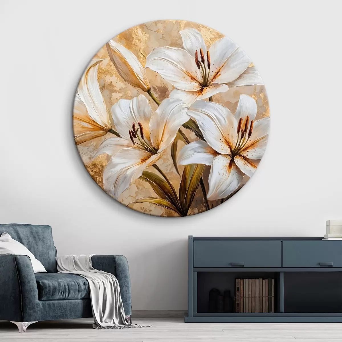 Tableaux rondes Lys blancs avec centre jaune sur fond beige texturé r42216