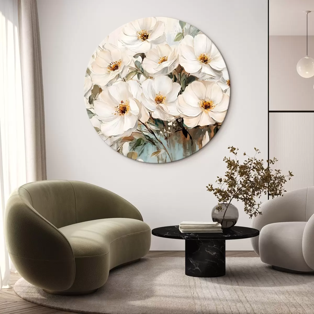 Tableaux rondes Bouquet de grandes fleurs blanches dans le style de la peinture à l'huile avec des centres jaunes sur un fond clair Nr r42222