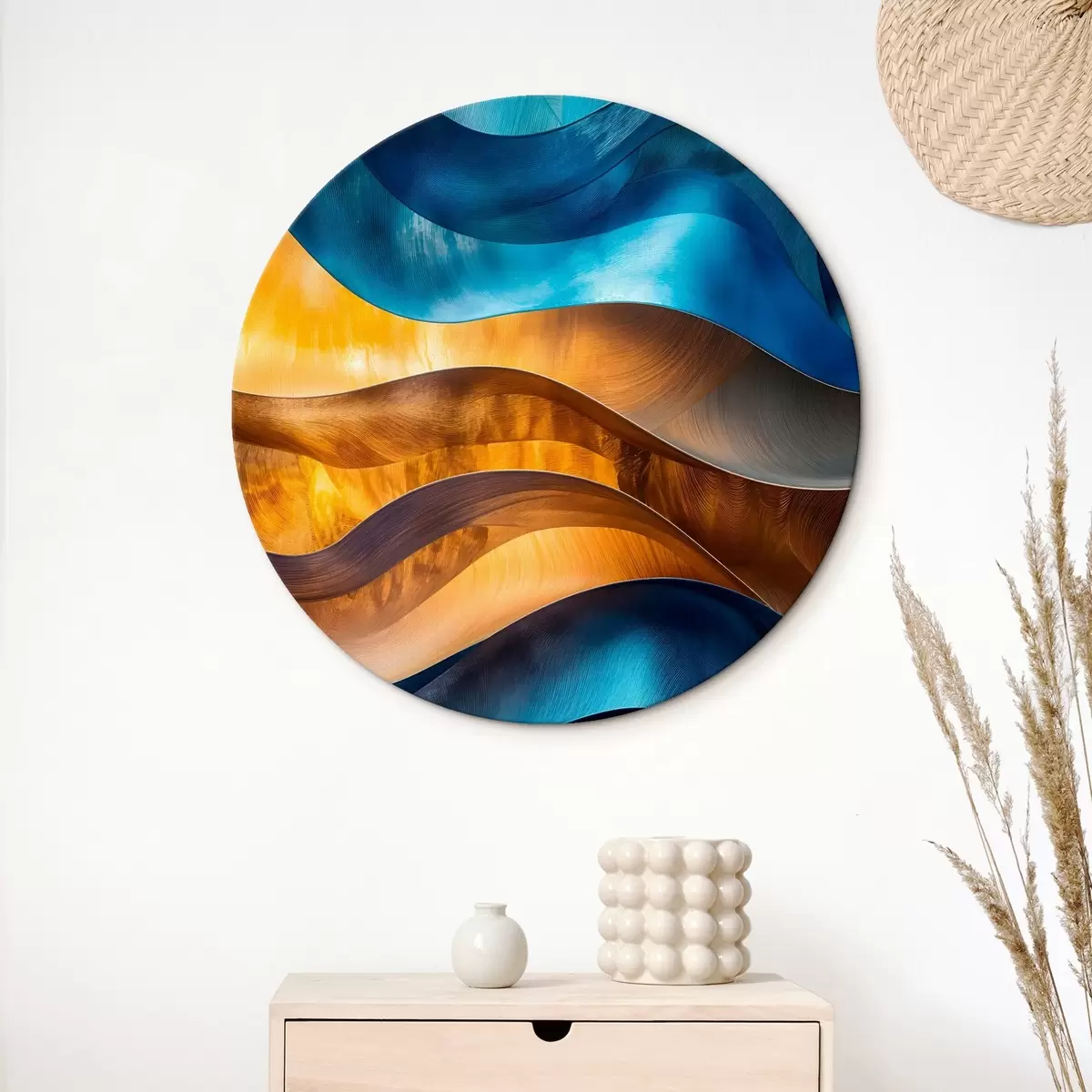 Tableaux rondes Art moderne abstrait formes ondulées dans les tons bleu, orange et marron Nr r42224