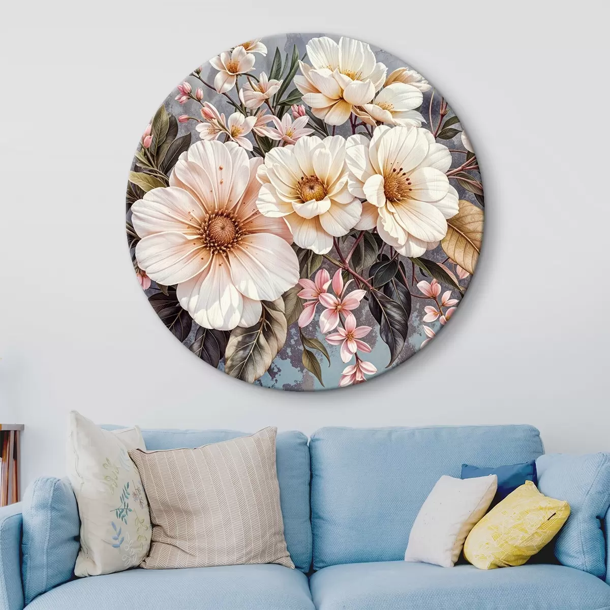 Tableaux rondes Un bouquet vibrant de grandes fleurs de dahlia blanches et roses détaillées avec des feuilles vertes sur un fond sombre Nr r42227