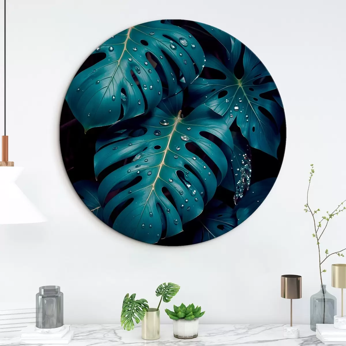 Tableaux rondes Feuilles de monstera tropicales luxuriantes avec des gouttelettes d'eau sur un fond sombre, créant une impression lunatique et atmosphérique r42233