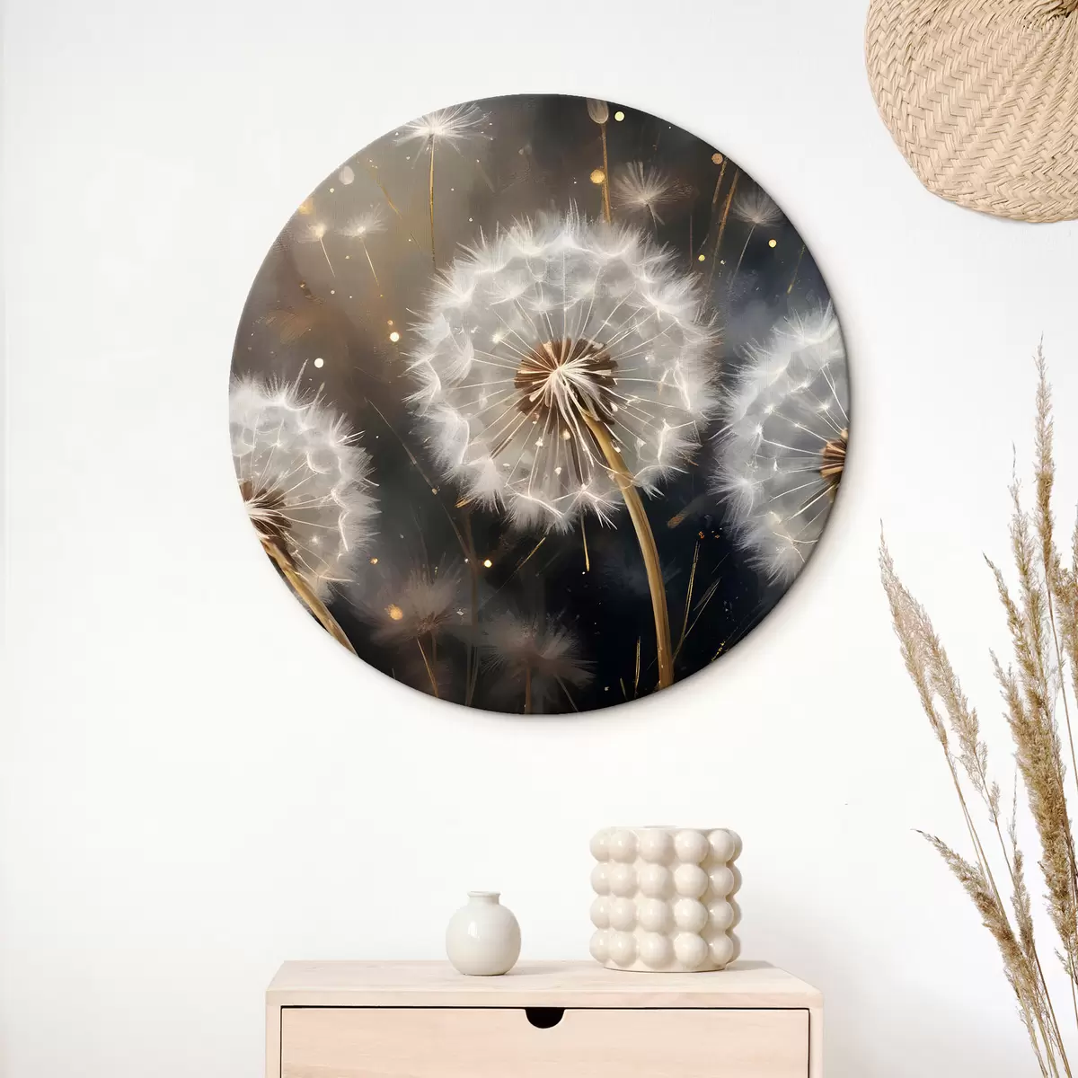 Tableaux rondes Fleurs de pissenlit avec leurs têtes de graines blanches et duveteuses sur un fond sombre, créant une atmosphère magique Nr r42235