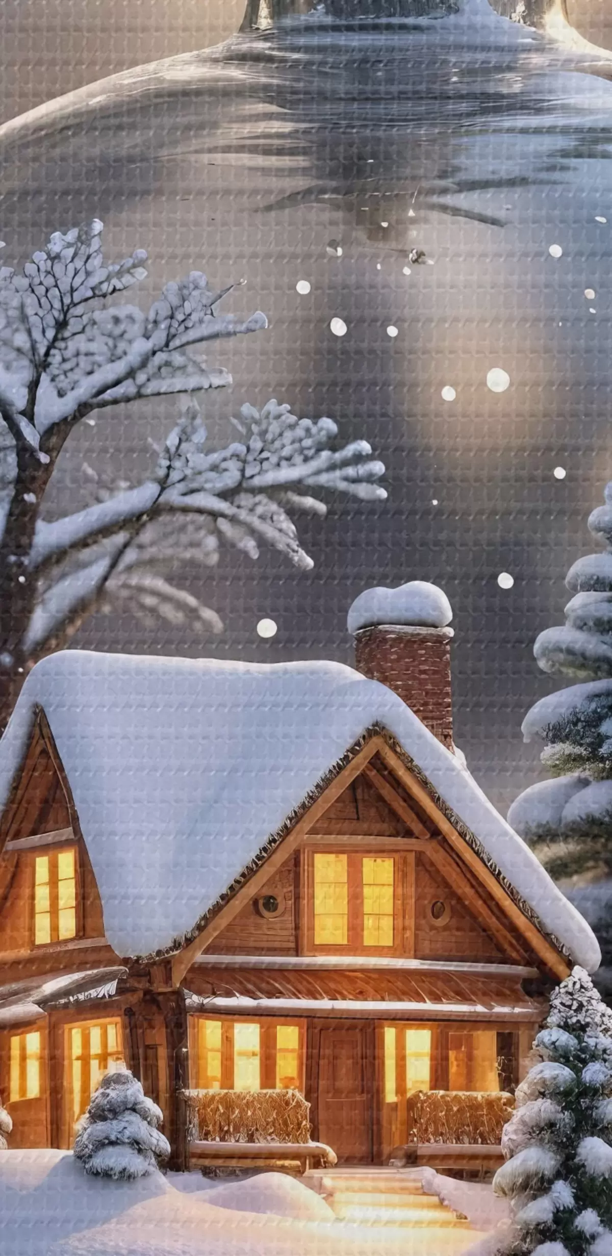 Tableaux rondes Globe de Noël en verre avec un paysage hivernal enneigé à l'intérieur, représentant une cabane confortable dans les bois avec des pins r42236