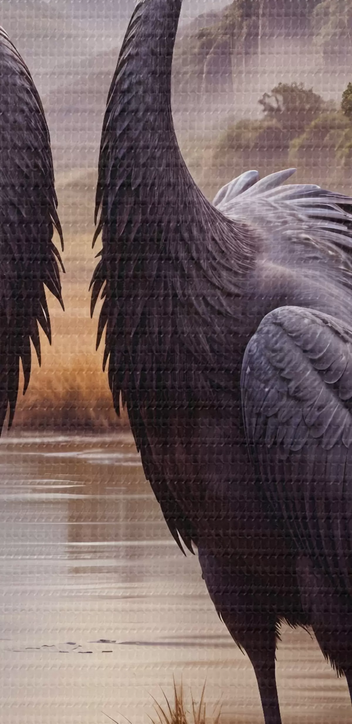 Tableaux rondes Deux grandes grues noires se tenant dans un étang peu profond, avec un paysage montagneux en arrière-plan Nr r42240