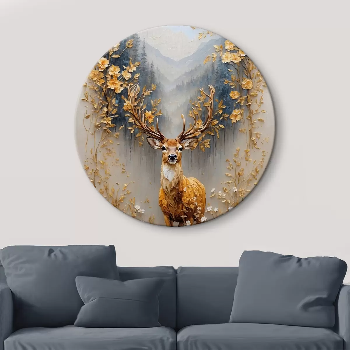Tableaux rondes Cerf avec de grands bois sur fond de forêt Nr r42252