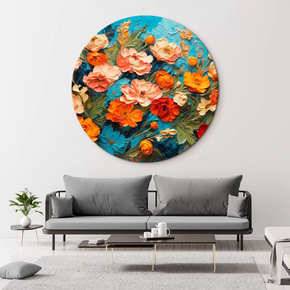 Tableaux rondes Diverses fleurs sur fond bleu abstrait dans le style de la peinture à l'huile Nr r42269