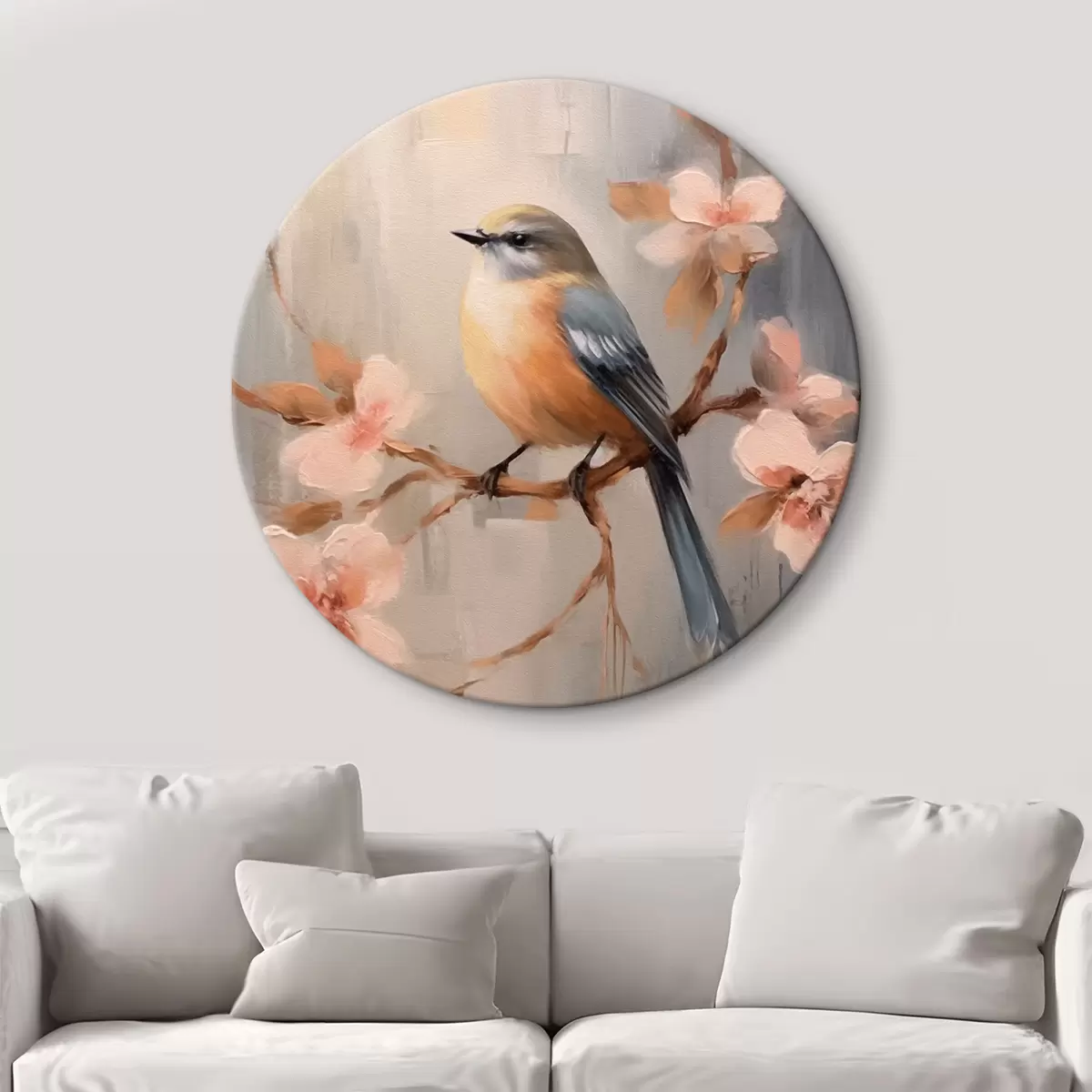 Tableaux rondes Oiseau sur une branche et fleurs roses Nr r42302
