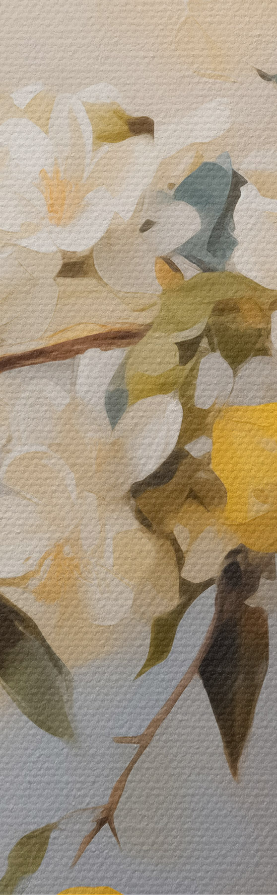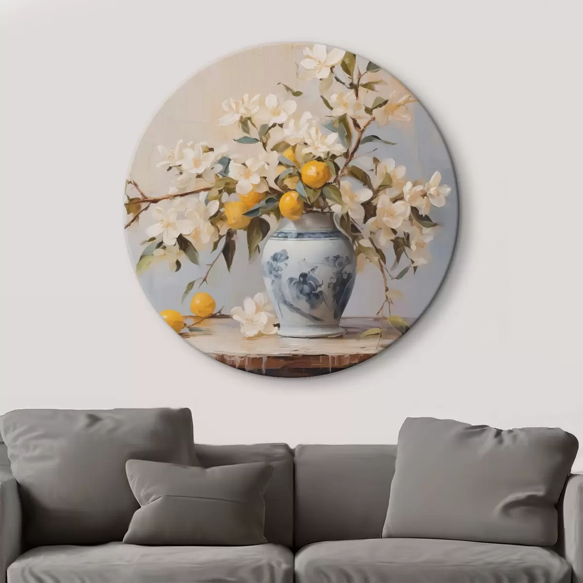 Tableaux rondes Vase avec branches de fleurs blanches et peinture imitation citron r42360