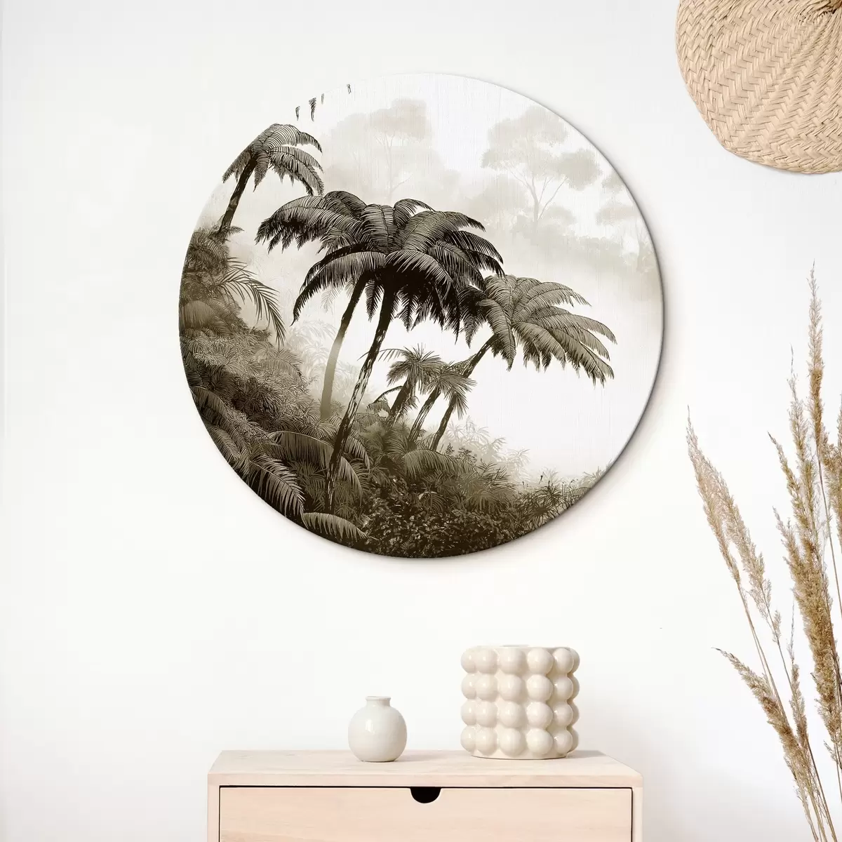 Tableaux rondes Forêt de jungle dans la brume, palmiers, nature, couleurs beiges Nr r42372