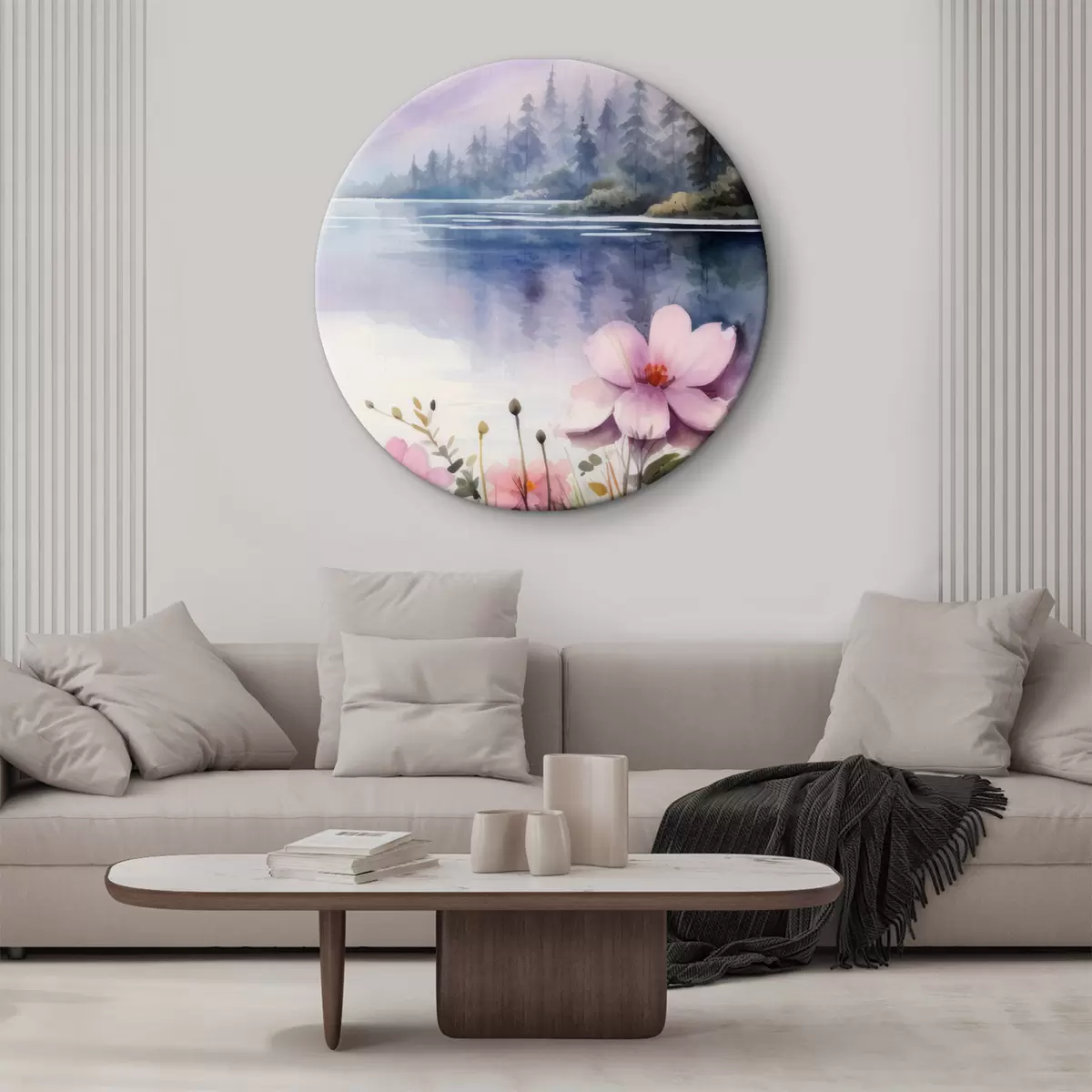 Tableaux rondes Fleurs roses sur fond de lac dans les montagnes Nr r42393