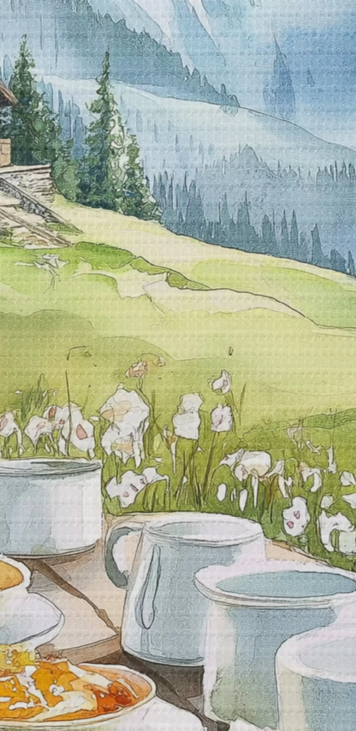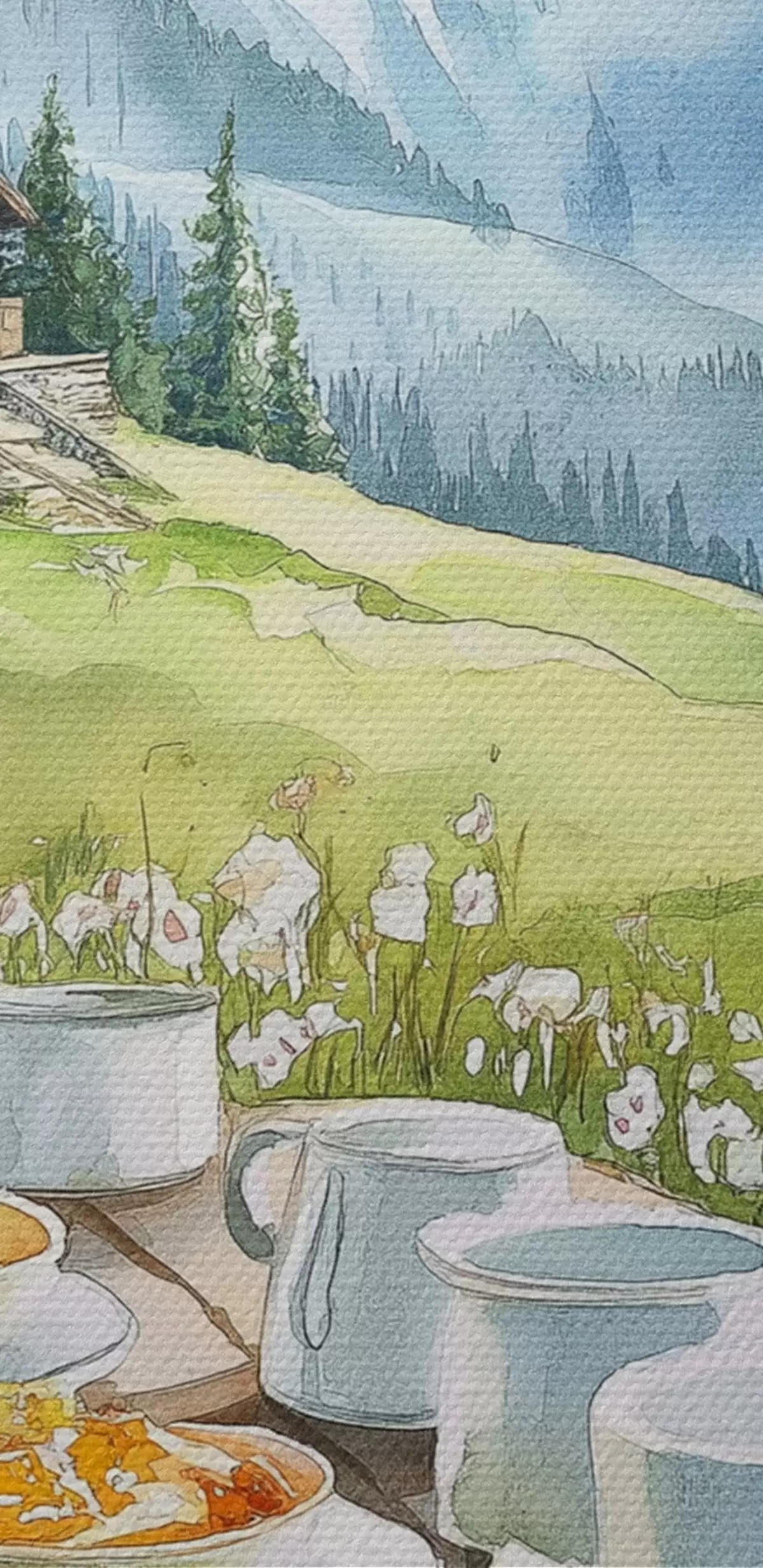 Tableaux rondes Petit déjeuner dans les Alpes, montagnes, forêt, nature, été, aquarelle r42426