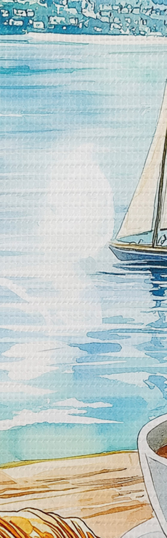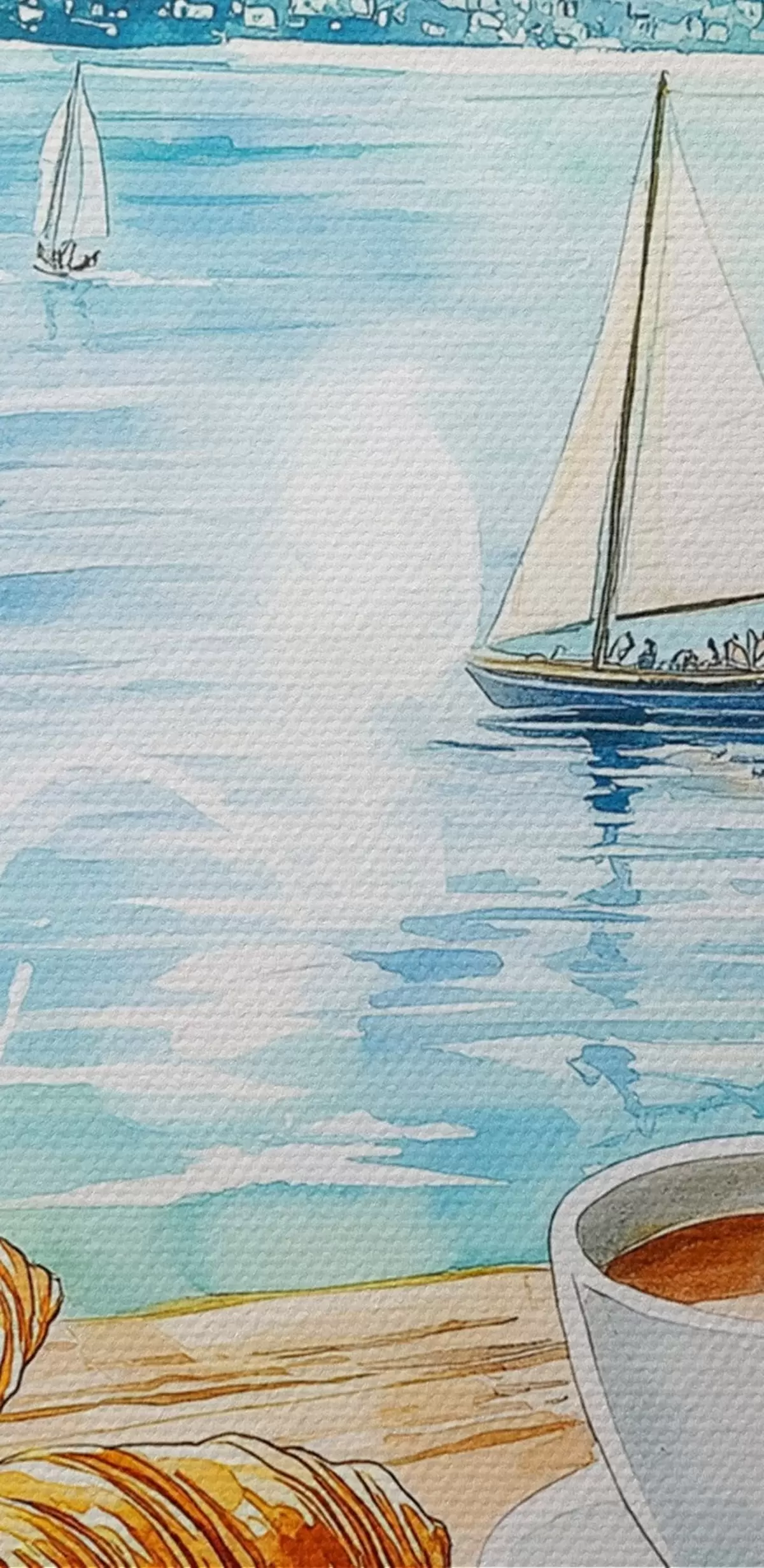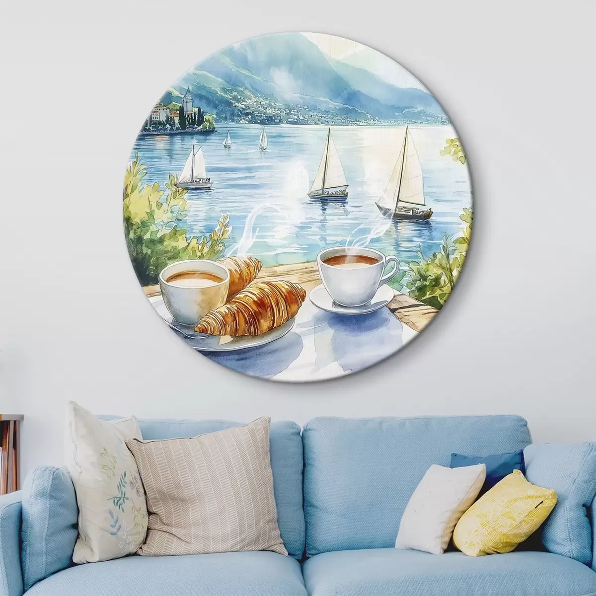 Tableaux rondes Lac d'été avec voiliers, tasses de café, croissants, style aquarelle Nr r42441