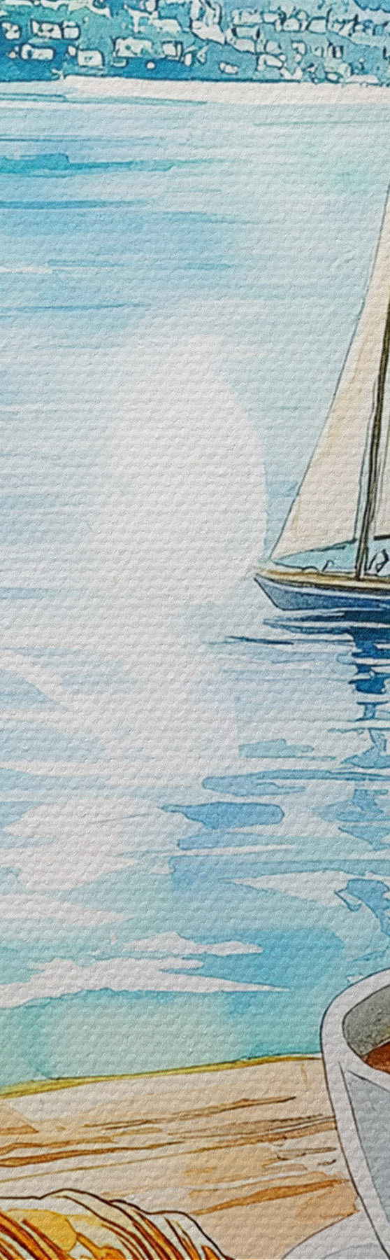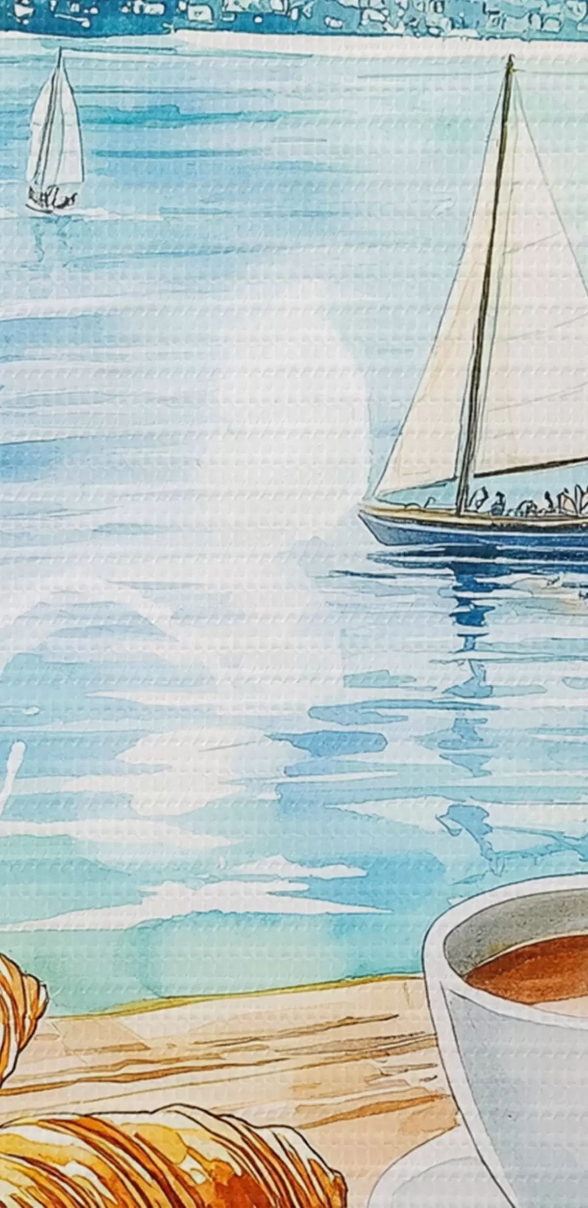 Tableaux rondes Lac d'été avec voiliers, tasses de café, croissants, style aquarelle r42441