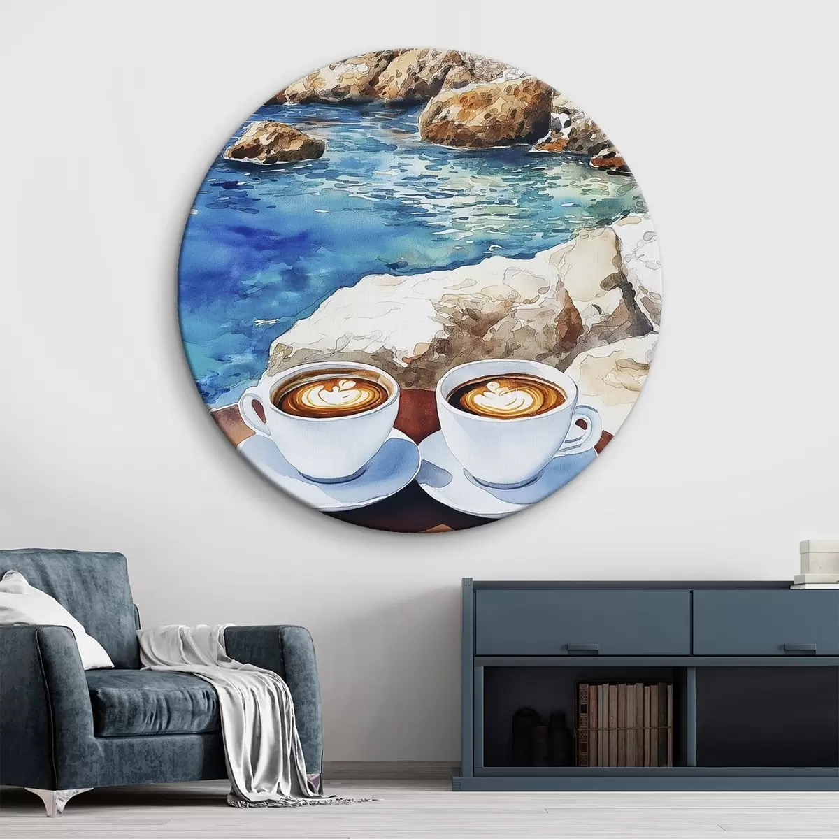 Tableaux rondes Aquarelle bord de mer avec tasses de café, été Nr r42449