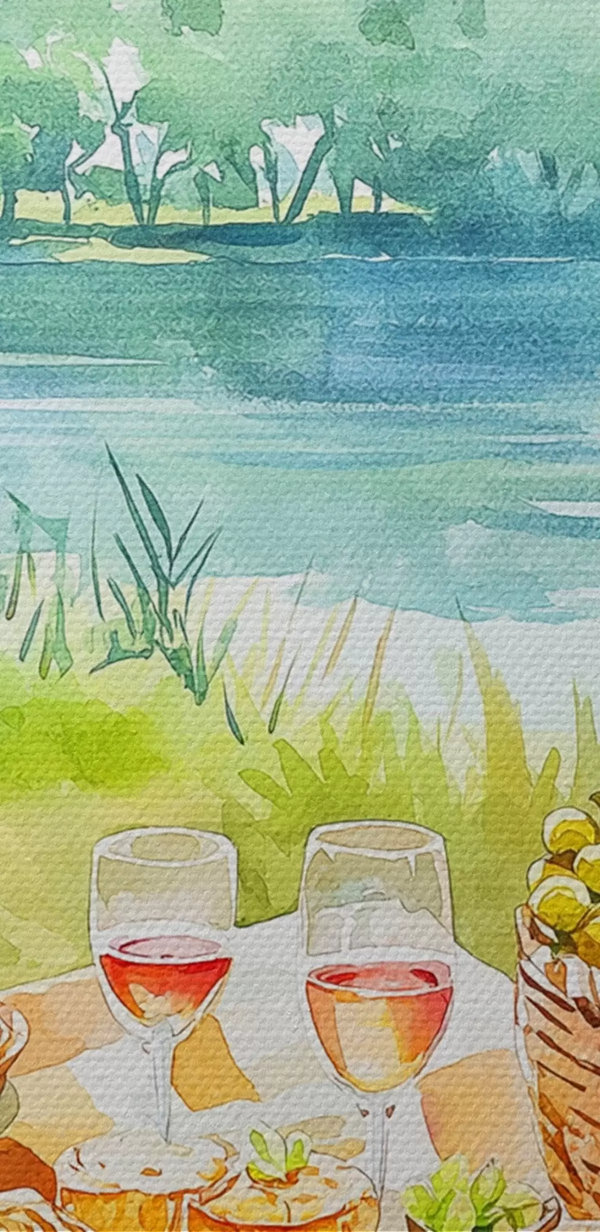 Tableaux rondes Esthétique du pique-nique, nature estivale, lac, romantique, style aquarelle r42450