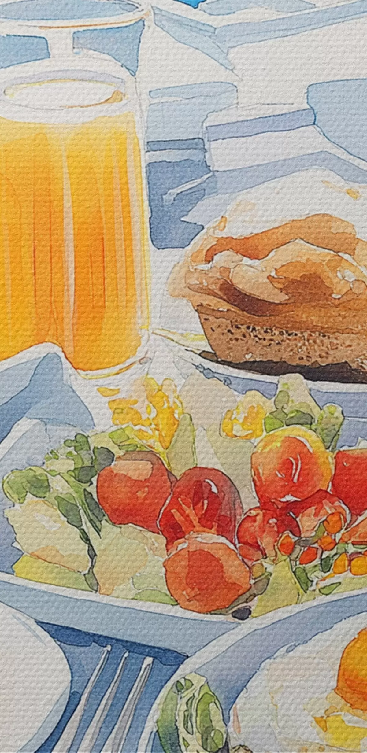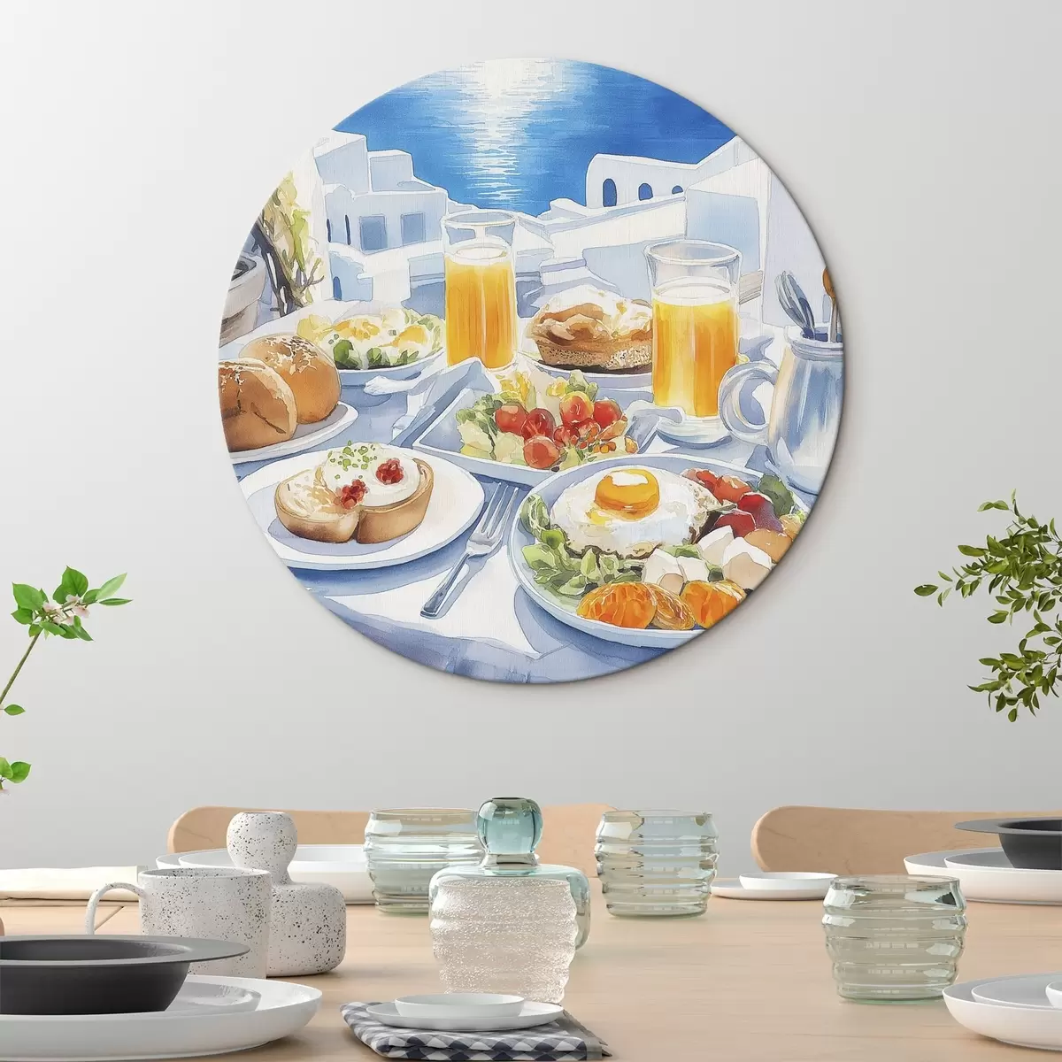 Tableaux rondes Paysages de Santorin, petit déjeuner, style aquarelle, vieille ville r42454