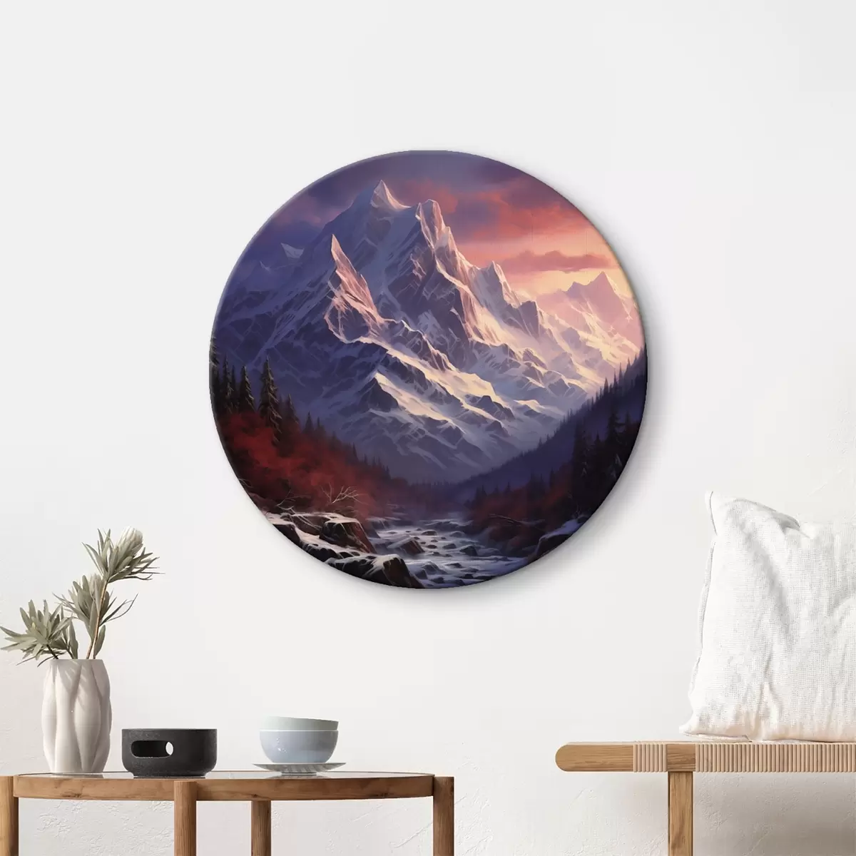 Tableaux rondes Un paysage de montagne à couper le souffle au coucher du soleil, avec des sommets enneigés, des pins sombres et de douces teintes rose-violet dans le ciel. r42566
