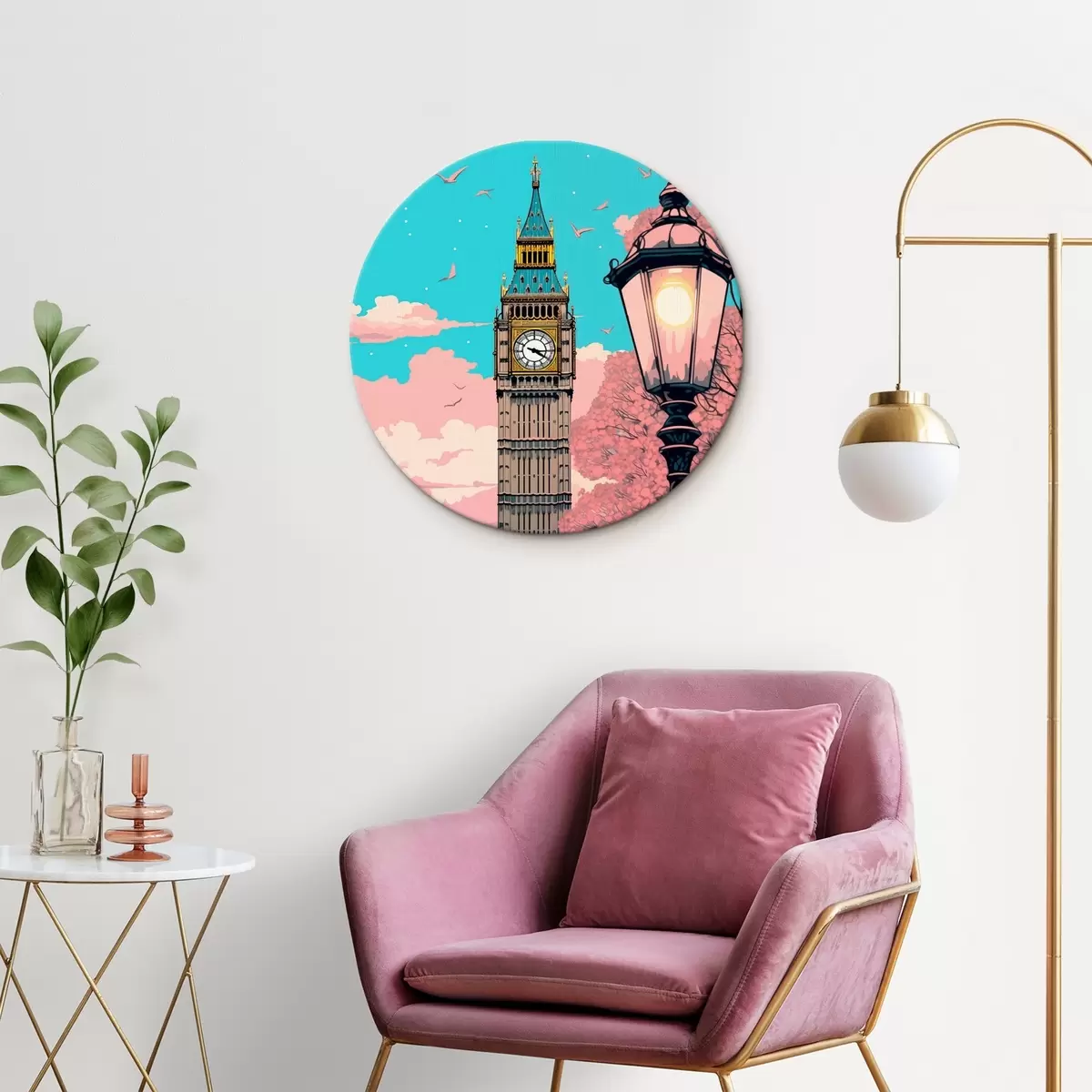 Tableaux rondes Une vue de Big Ben avec des arbres roses de printemps, un ciel bleu vif et un lampadaire vintage au premier plan Nr r42578