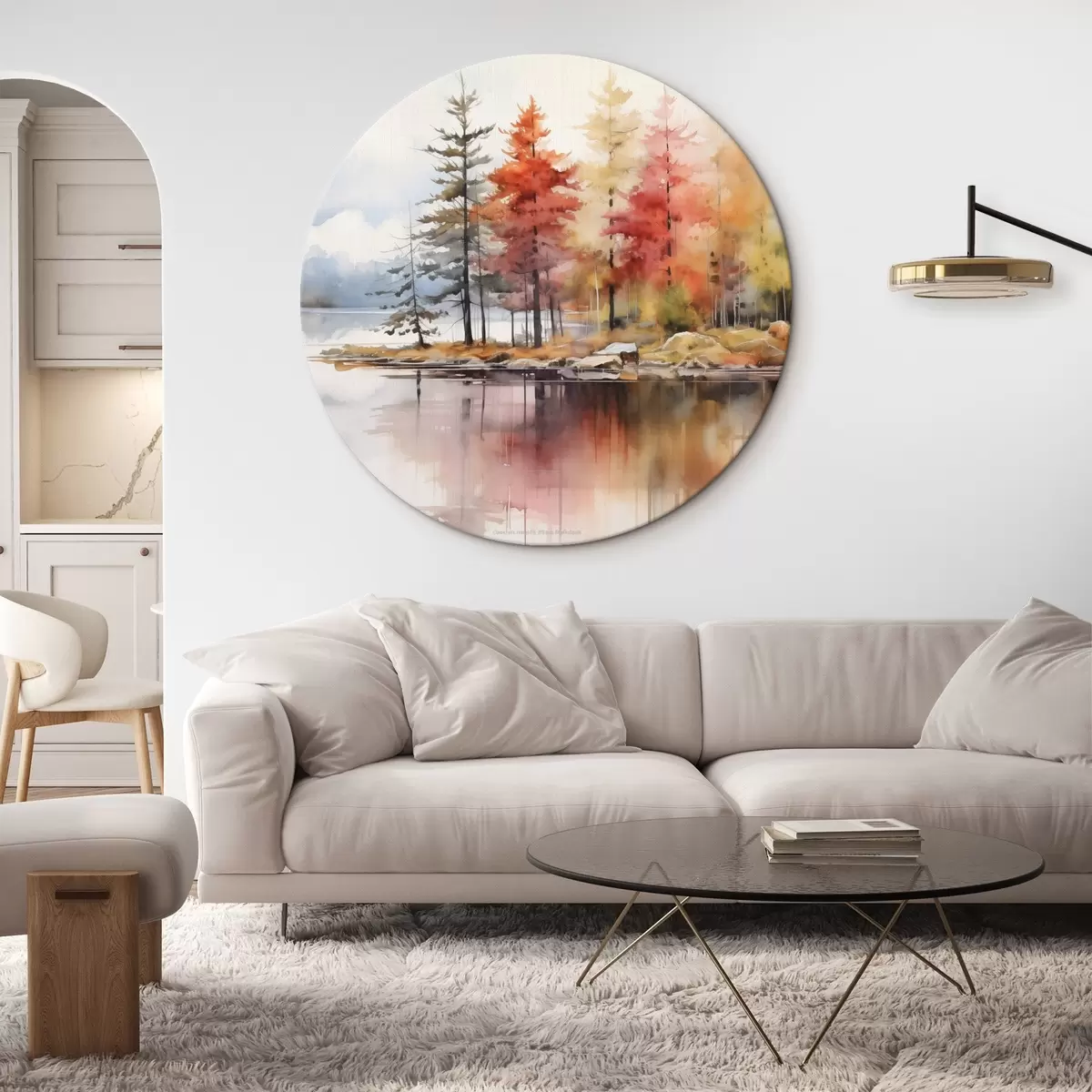 Tableaux rondes Paysage de type aquarelle avec un lac entouré d'arbres aux couleurs d'automne éclatantes Nr r42727