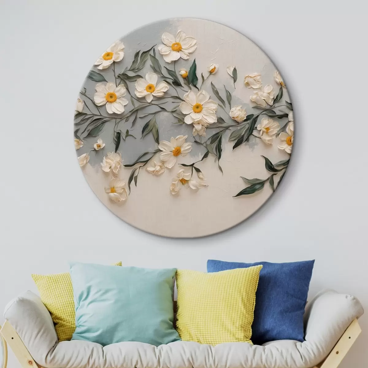 Tableaux rondes Fleurs et feuilles blanches sur fond blanc et gris Nr r42764