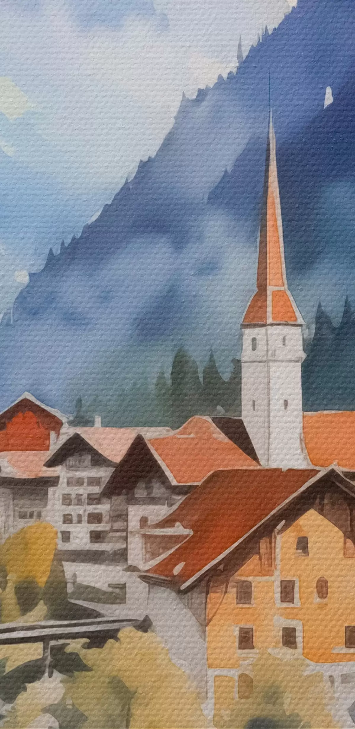 Tableaux rondes Village près des montagnes imitation aquarelle r42964