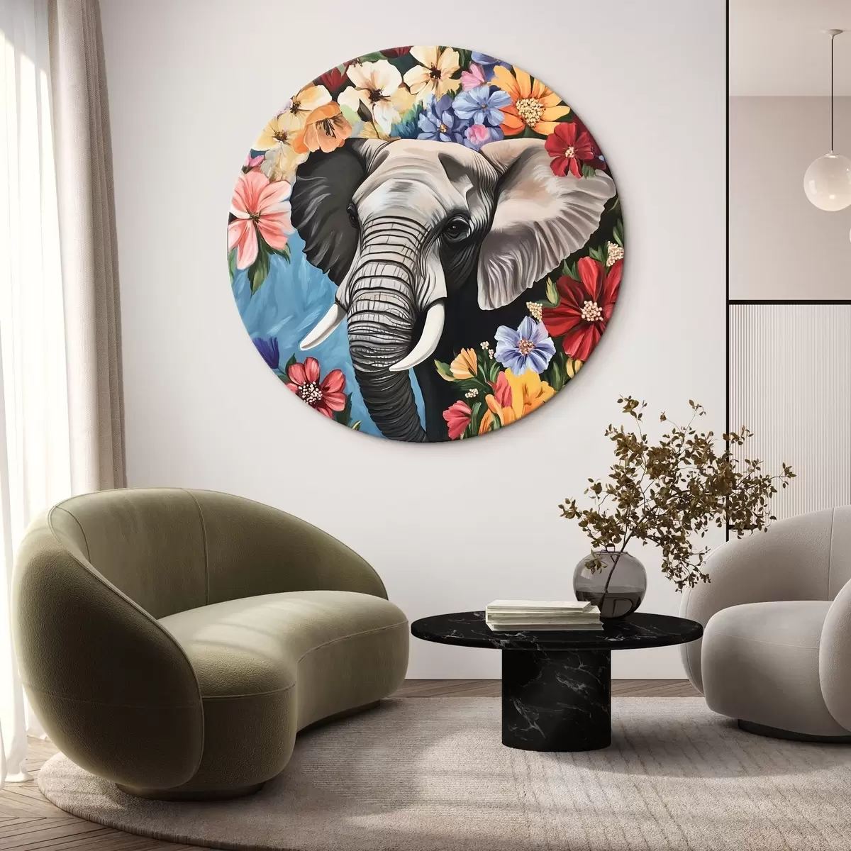 Tableaux rondes Éléphant dans des fleurs éclatantes Nr r42990