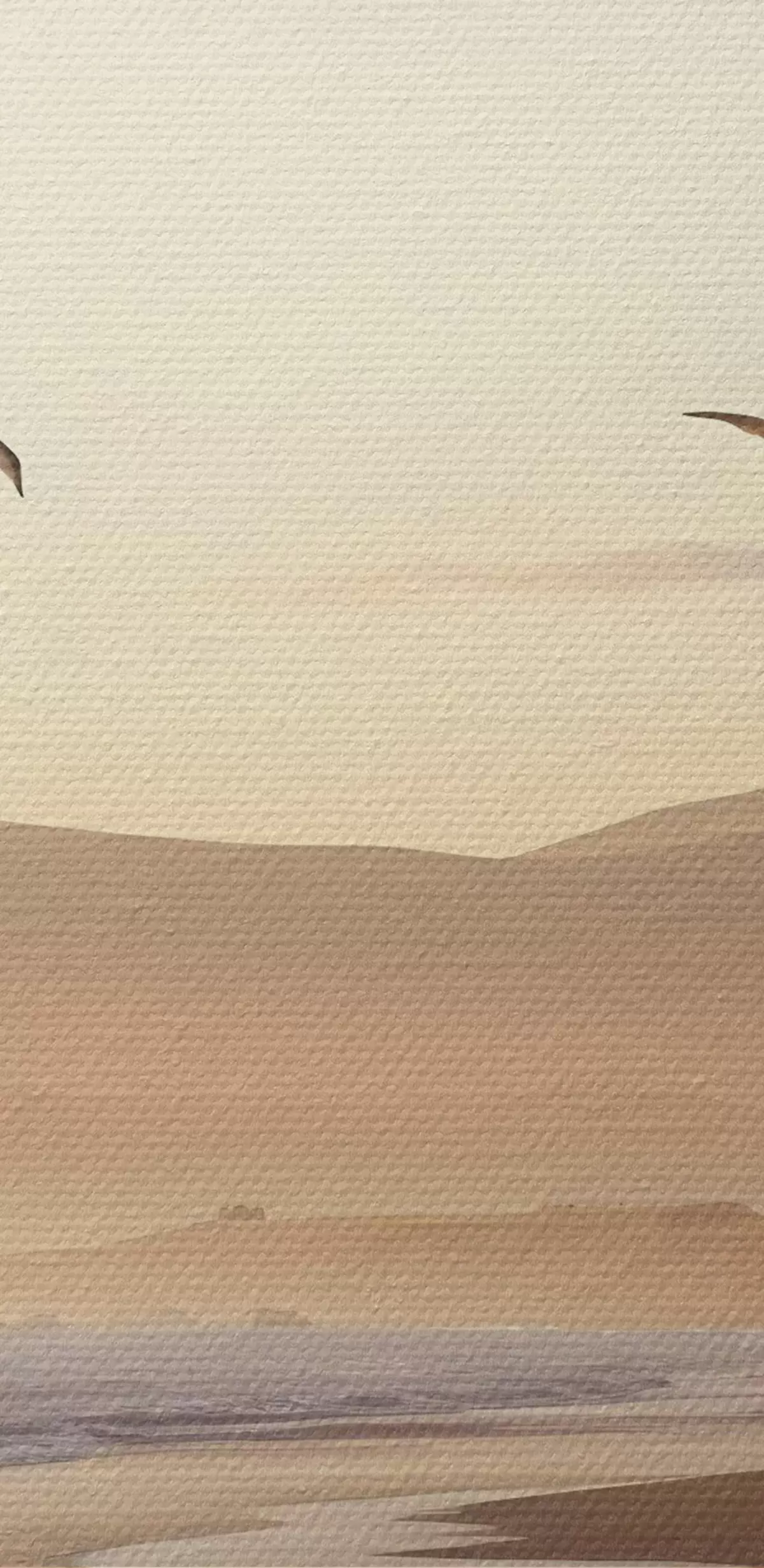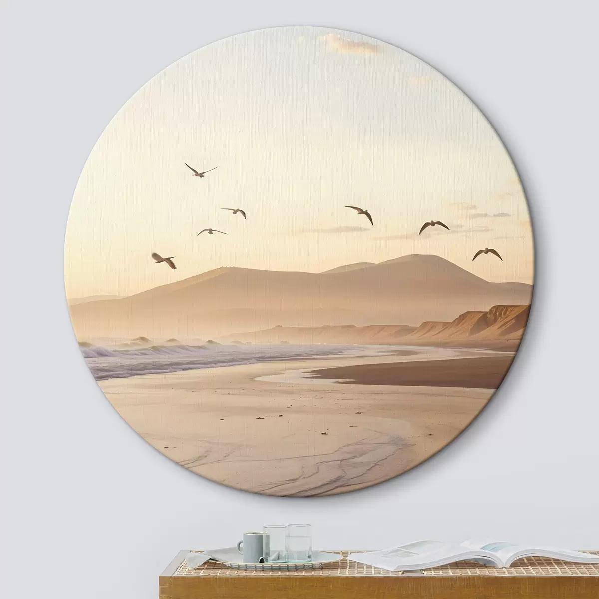 Tableaux rondes Oiseaux volant au-dessus de la plage avec l'océan et les montagnes en arrière-plan, couleurs chaudes, palette pastel douce Nr r43162