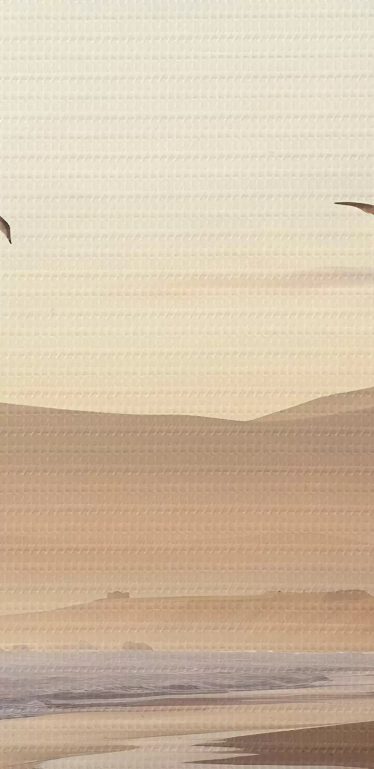 Tableaux rondes Oiseaux volant au-dessus de la plage avec l'océan et les montagnes en arrière-plan, couleurs chaudes, palette pastel douce r43162