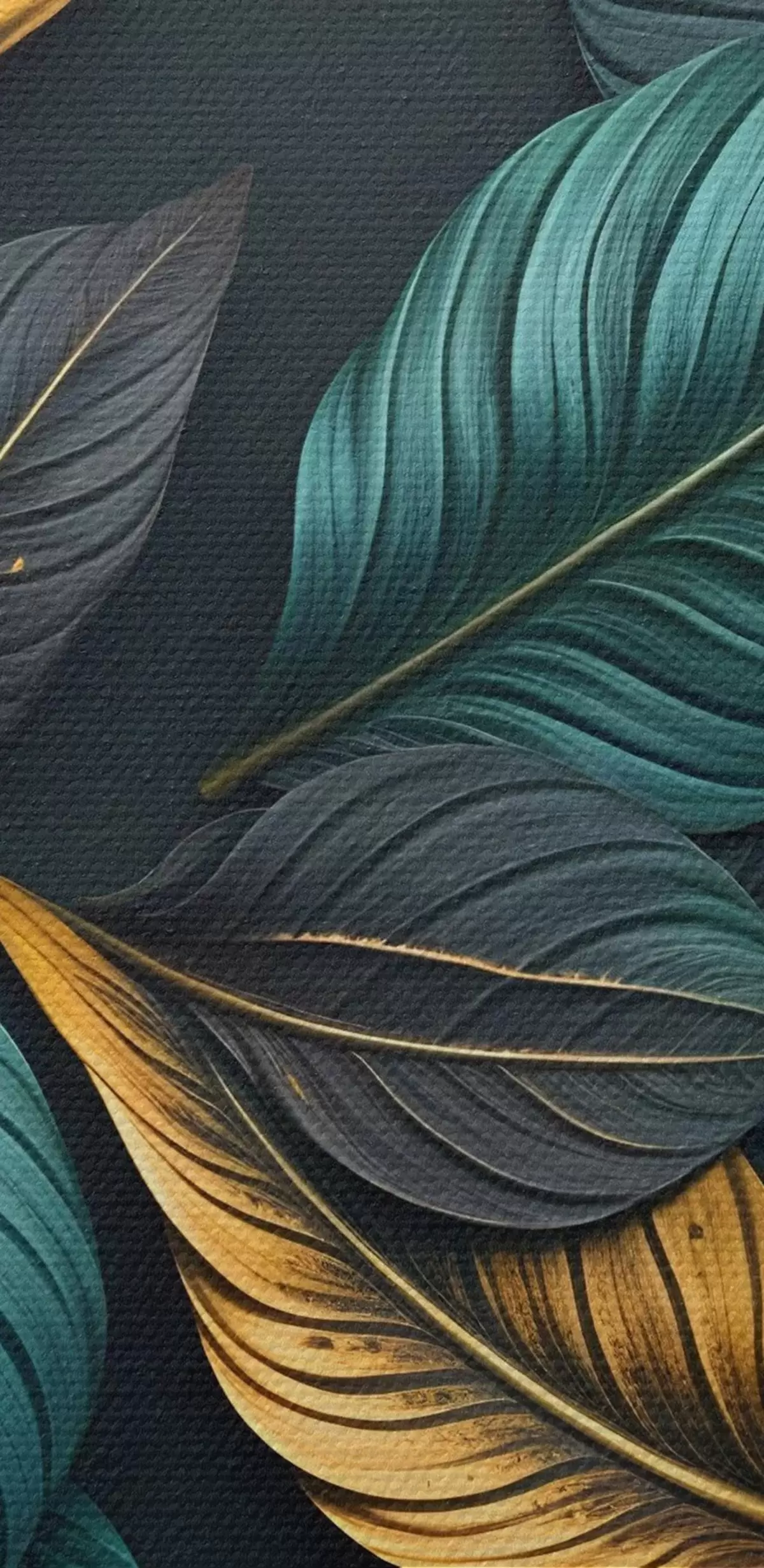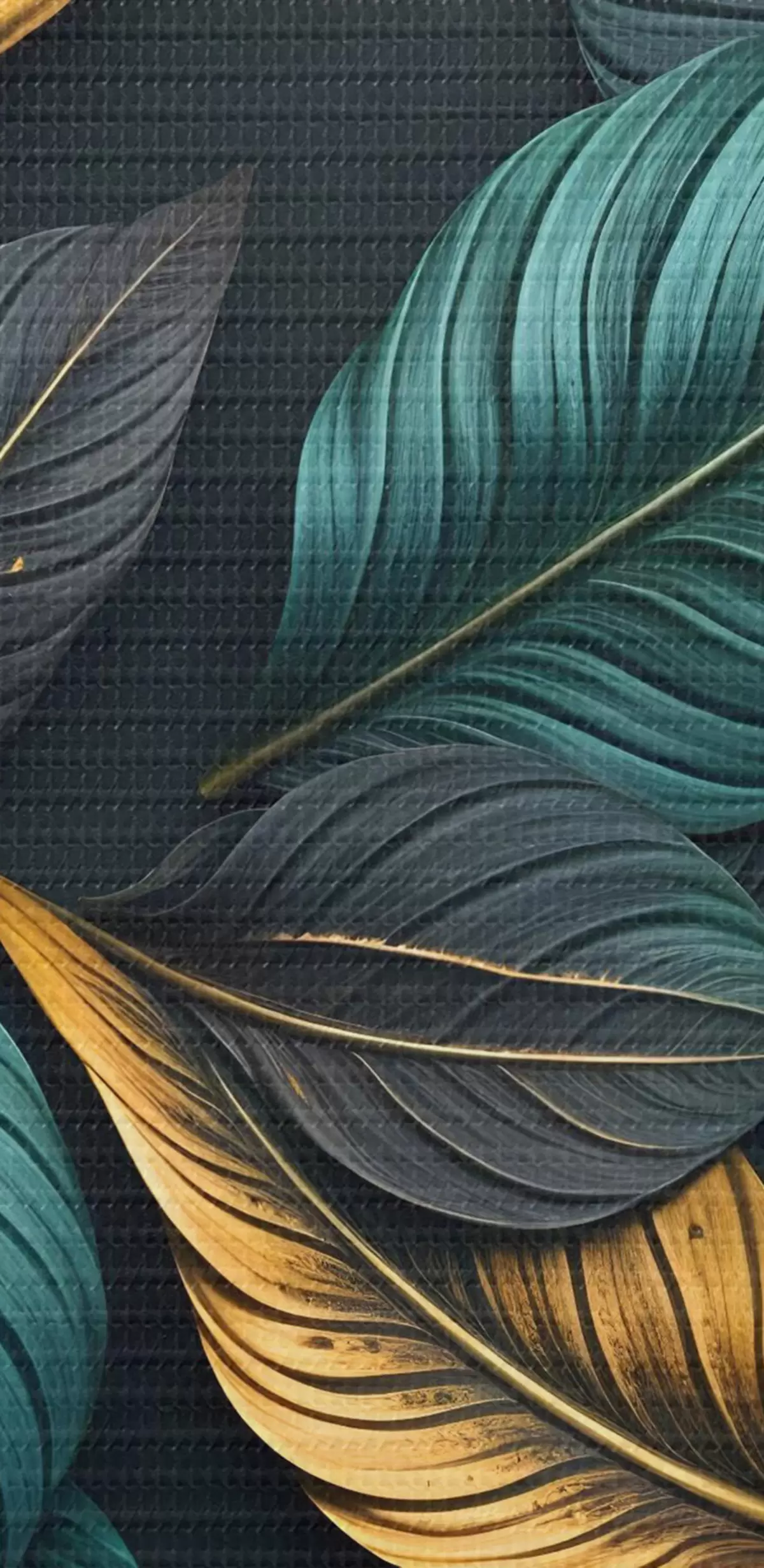 Tableaux rondes Feuilles vert foncé, jaunes et noires avec des veines foncées, sur un fond sombre, élégante ambiance tropicale r43164