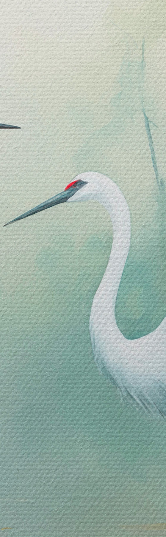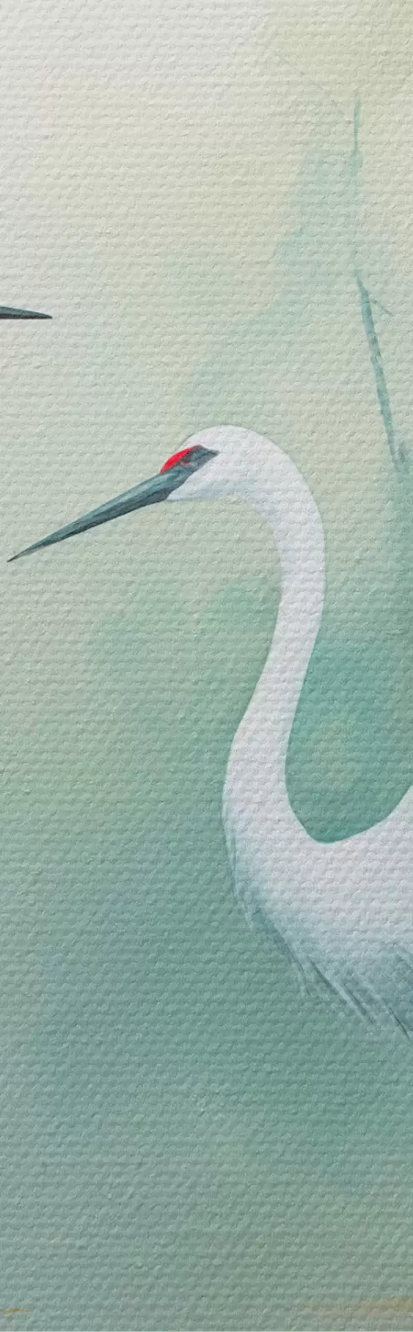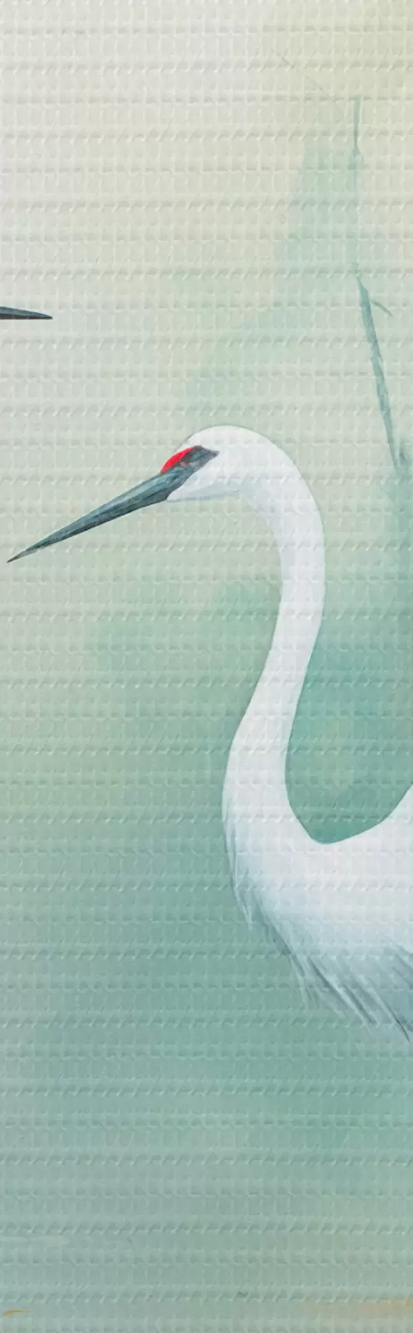 Tableaux rondes Deux grues blanches se tenant dans un étang, entourées d'une forêt verdoyante avec un éclairage doux et diffus r43166