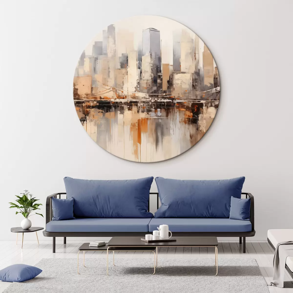 Tableaux rondes Peinture abstraite de paysage urbain avec de grands bâtiments dans des tons de brun, de gris et de blanc, se reflétant dans l'eau Nr r43168