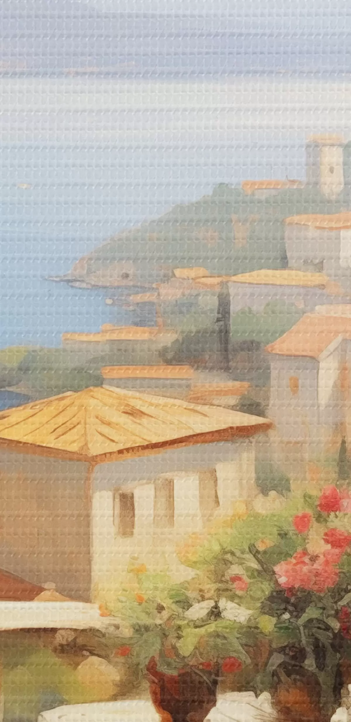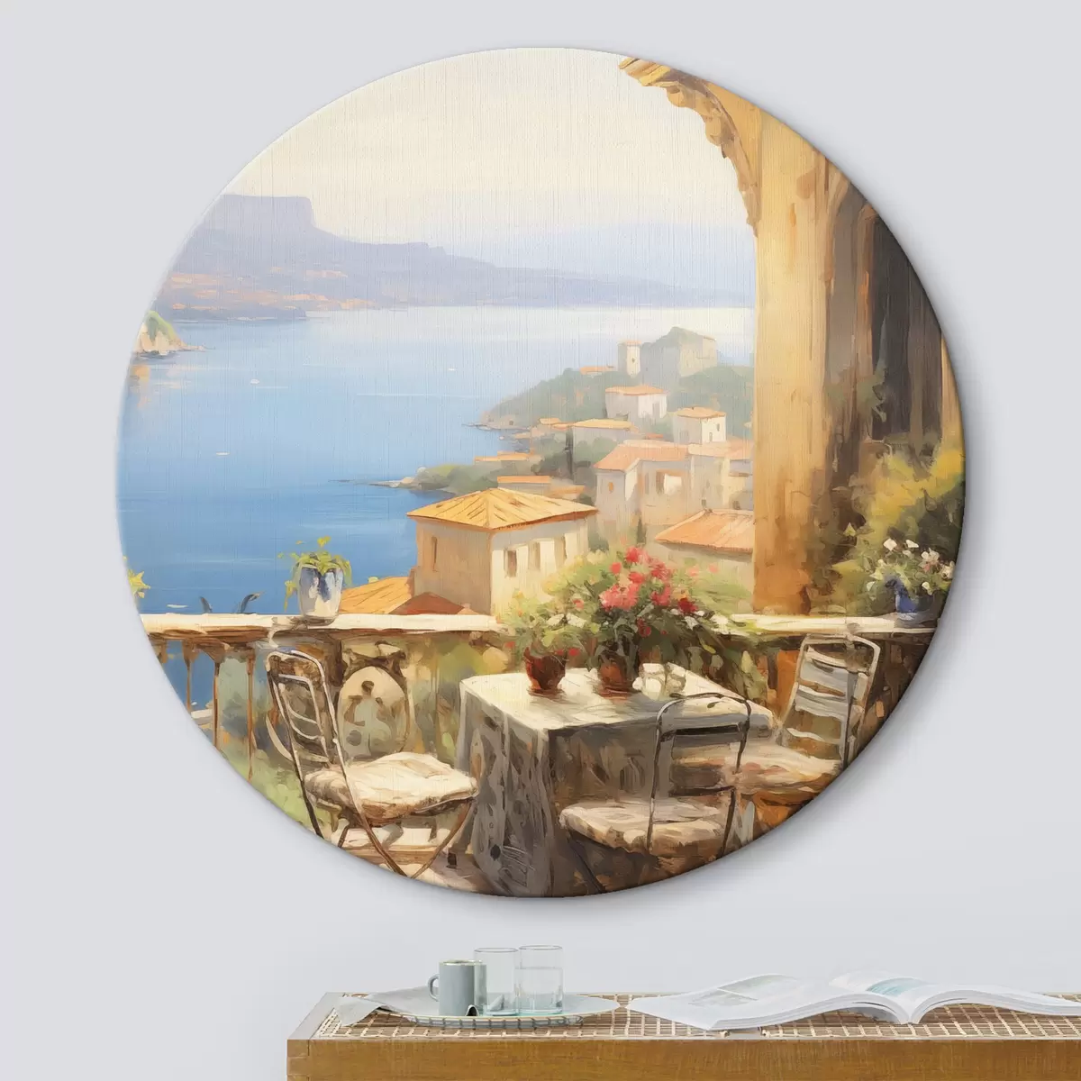 Tableaux rondes Peinture à l'huile imitation balcon avec fleurs, vue sur la mer, maisons sur la côte, journée ensoleillée, ciel bleu Nr r43173