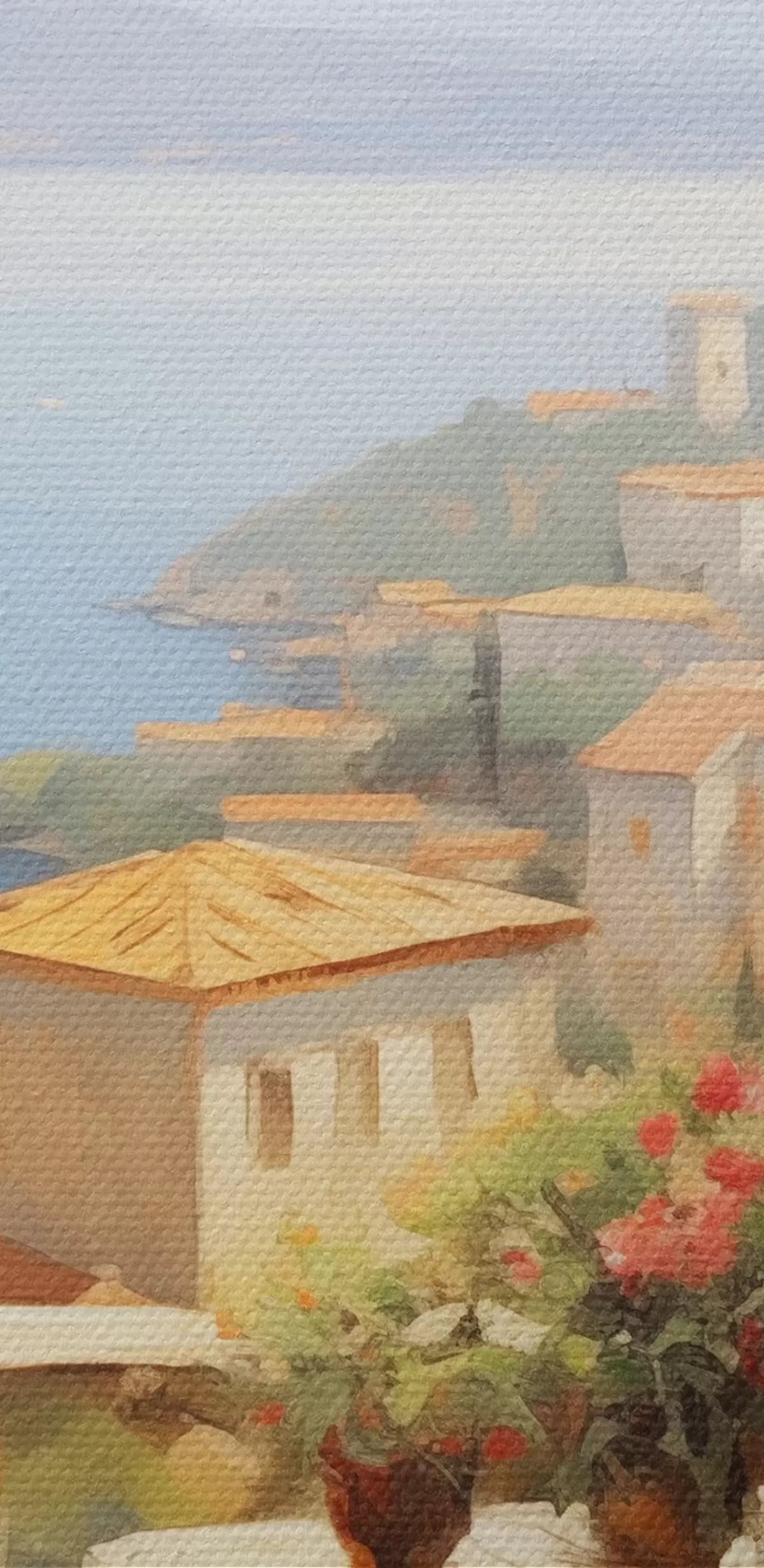 Tableaux rondes Peinture à l'huile imitation balcon avec fleurs, vue sur la mer, maisons sur la côte, journée ensoleillée, ciel bleu r43173