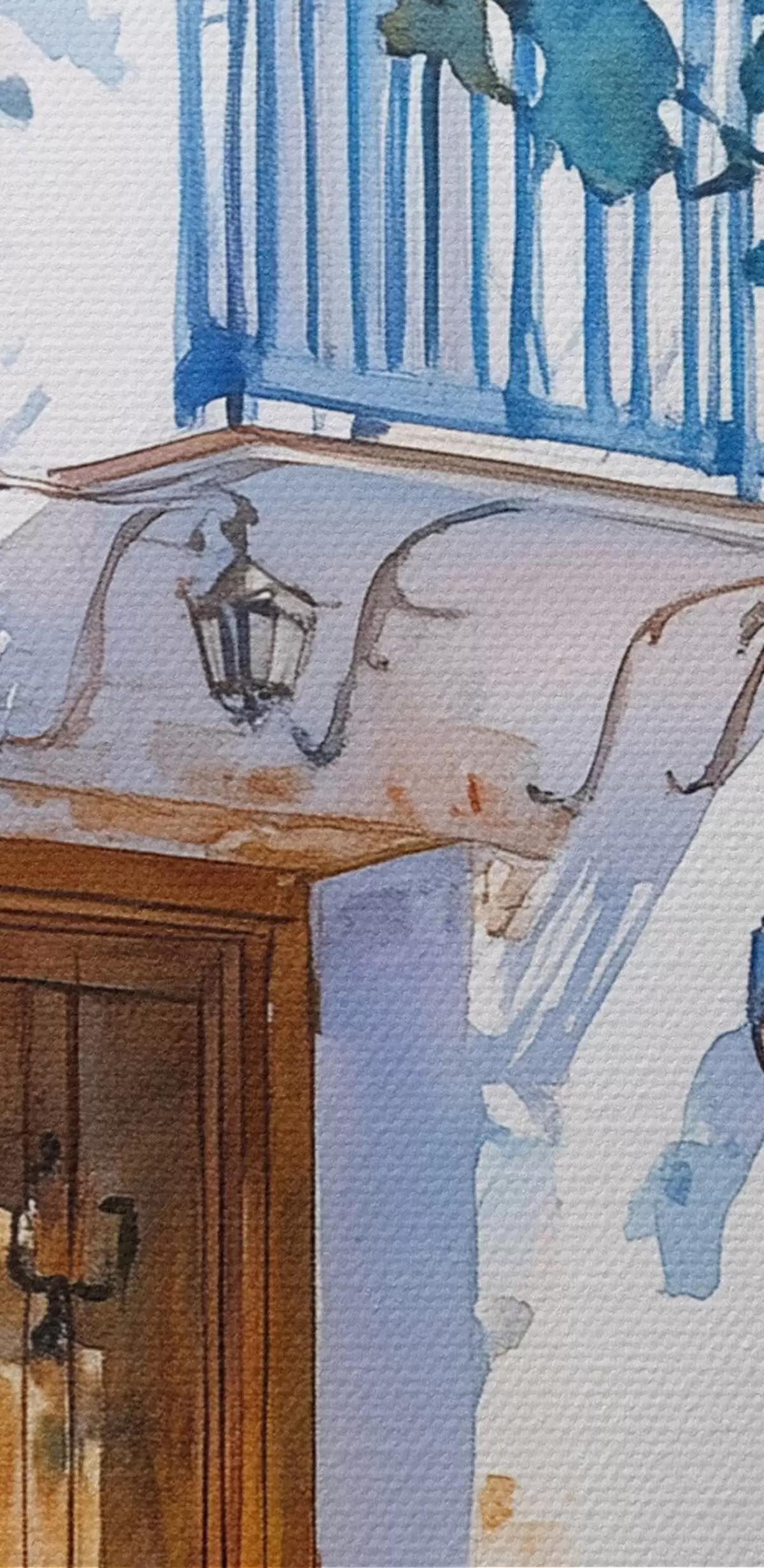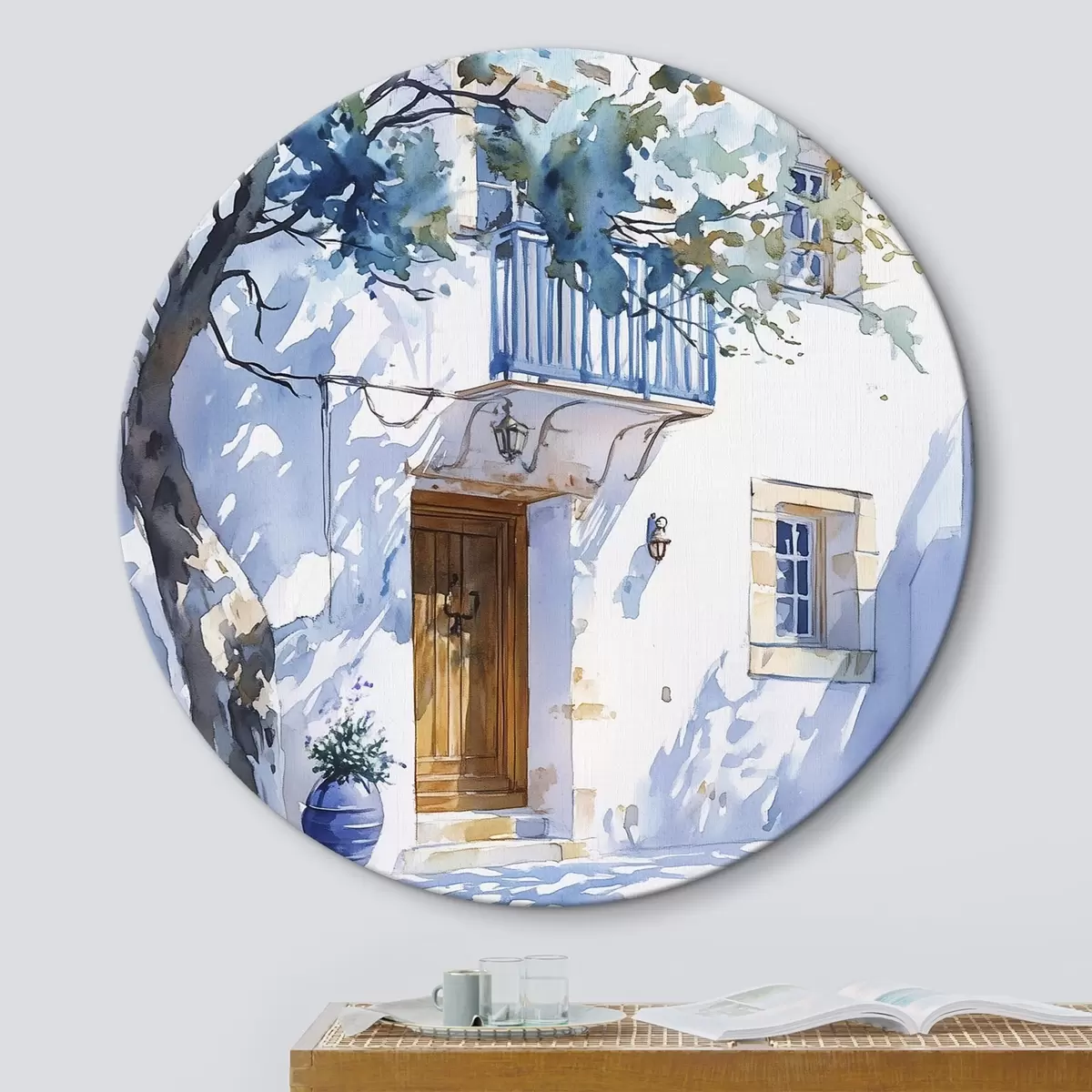 Tableaux rondes Aquarelle, maison grecque, arbre en fleurs, architecture Nr r43182