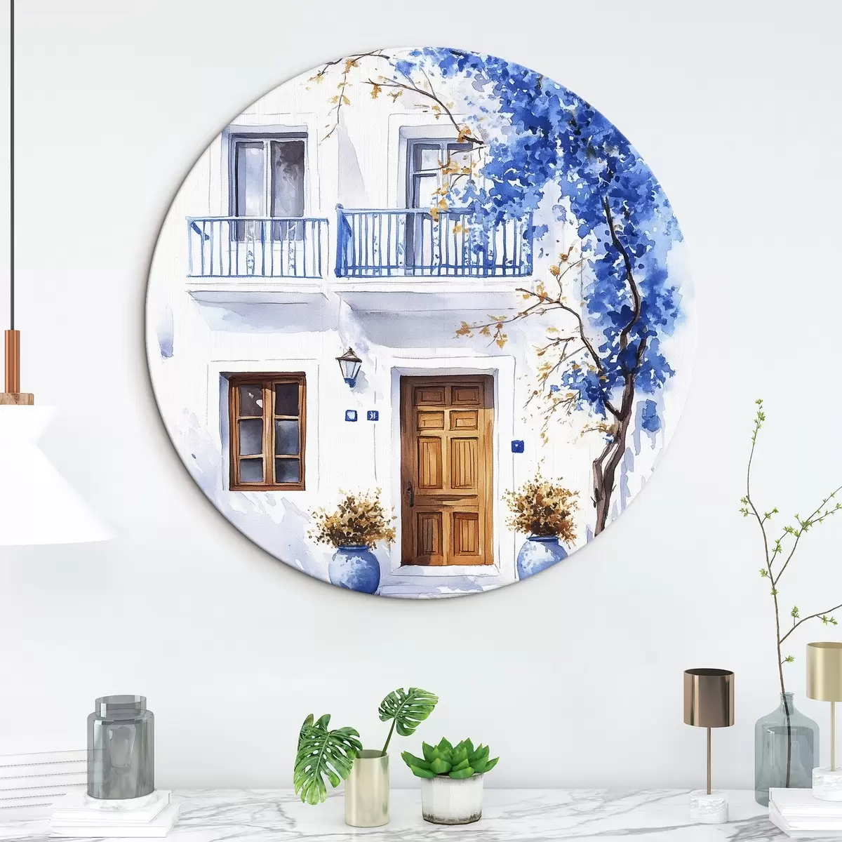 Tableaux rondes Arbre en fleurs avec des fleurs bleues, maison blanche, Grèce, style aquarelle Nr r43183