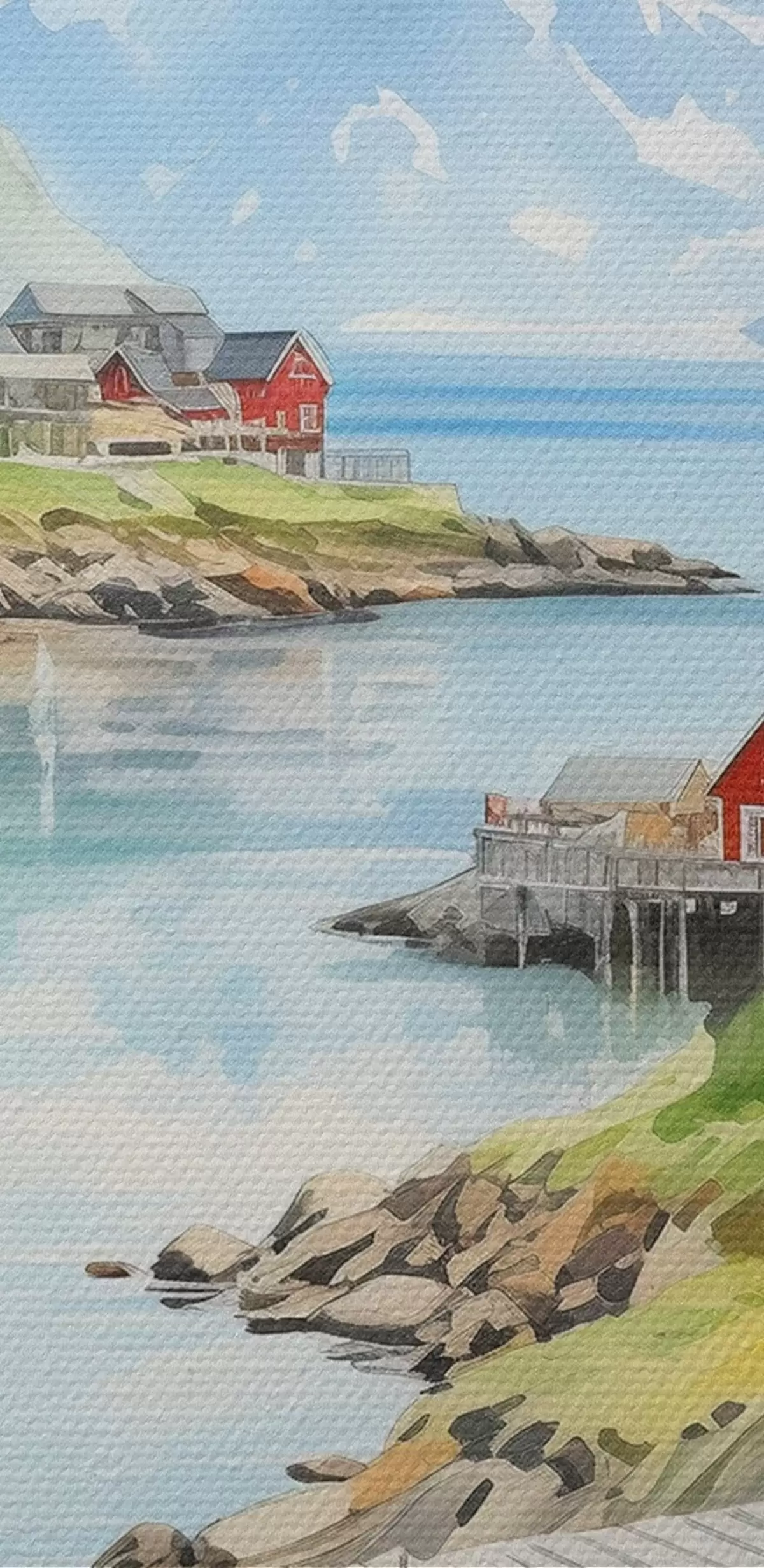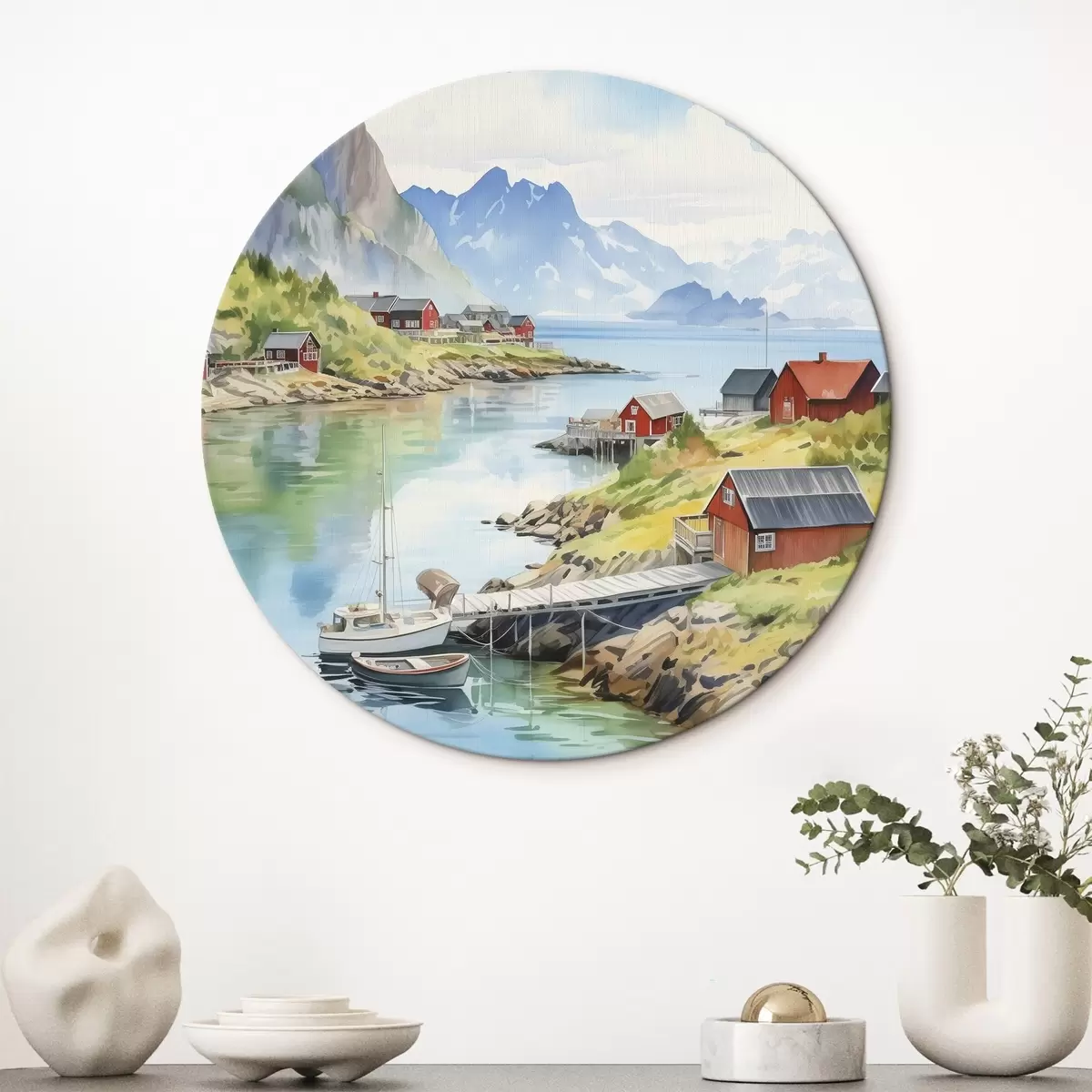 Tableaux rondes Paysage estival des îles Lofoten, maisons rouges, montagnes, bateaux Nr r43187