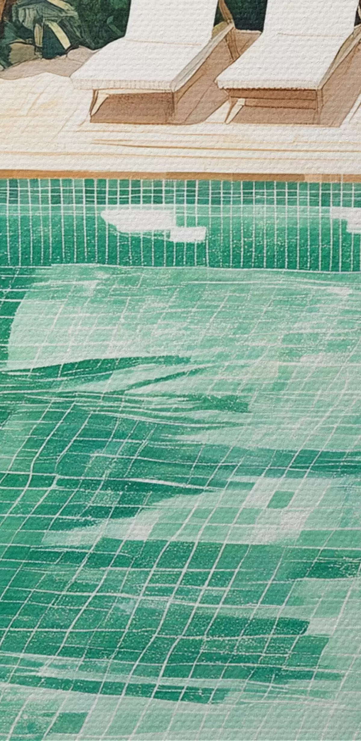 Tableaux rondes Piscine d'été dans un jardin verdoyant, style vintage, aquarelle r43189