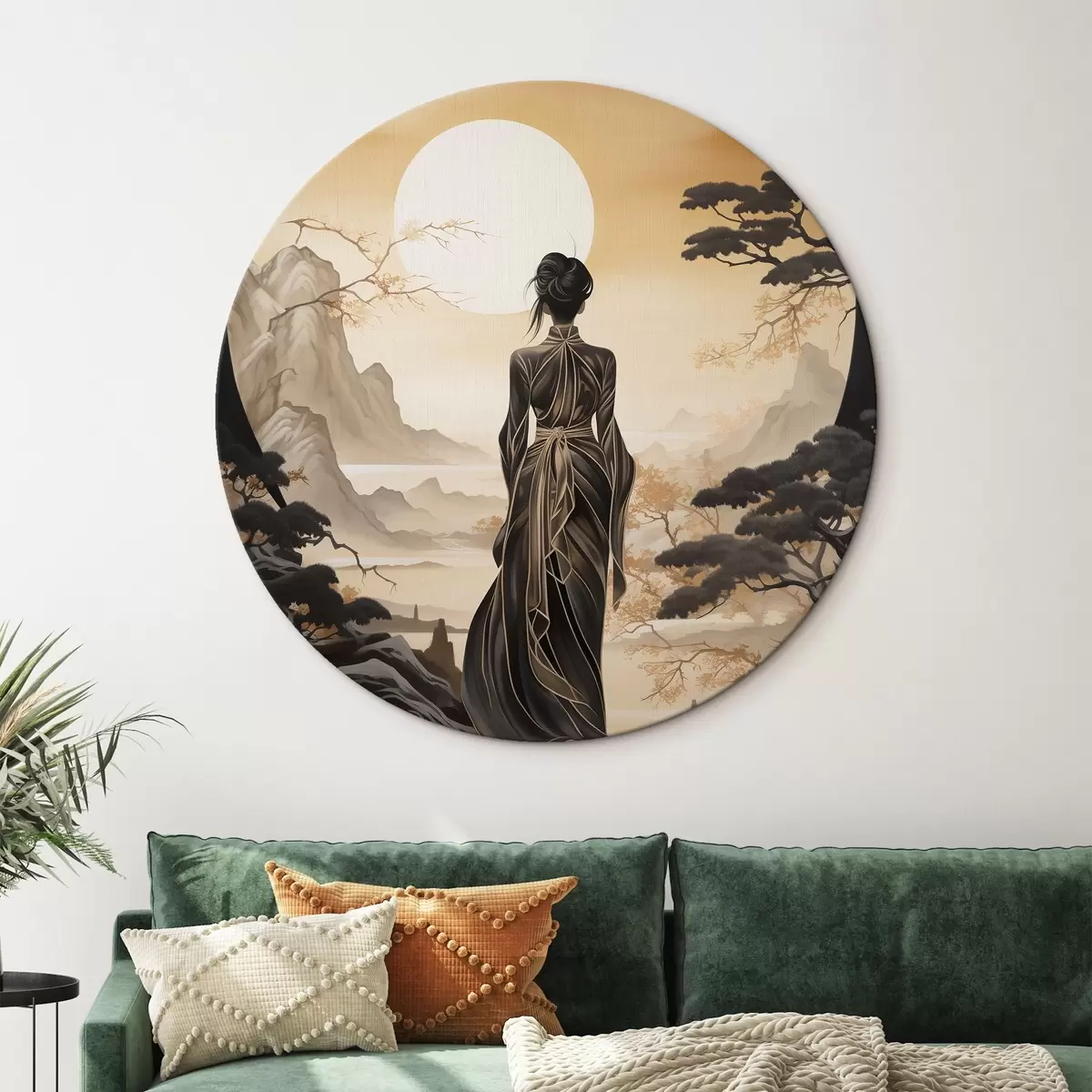 Tableaux rondes Personnes, Japon, fille au coucher du soleil sur fond de sakura et de montagnes Nr r43256