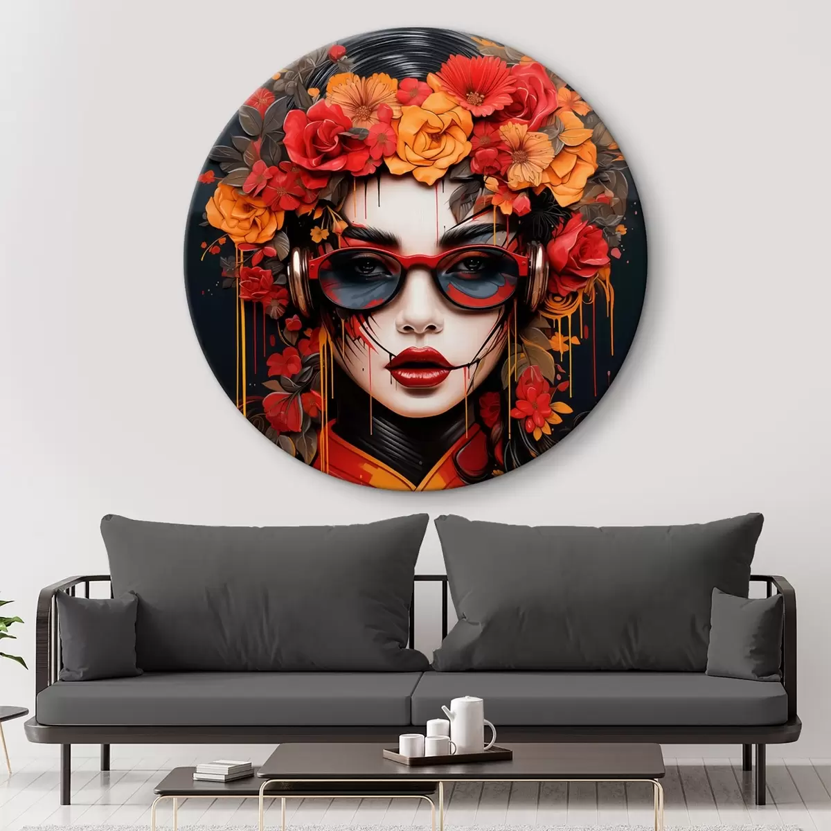 Tableaux rondes Femme avec des fleurs sur la tête, style street art Nr r43362