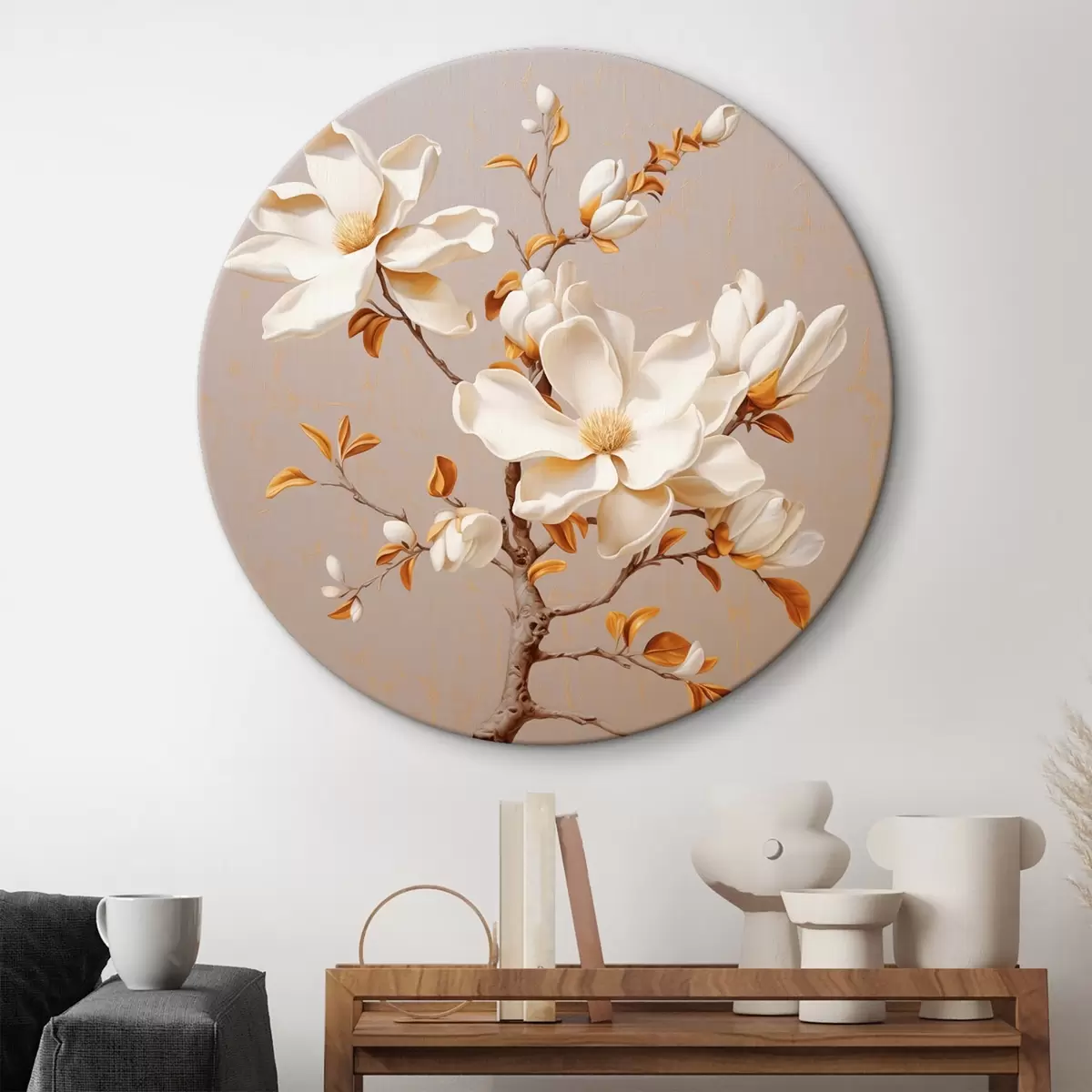 Tableaux rondes Branche de magnolia gracieuse dans les tons beiges Nr r43373