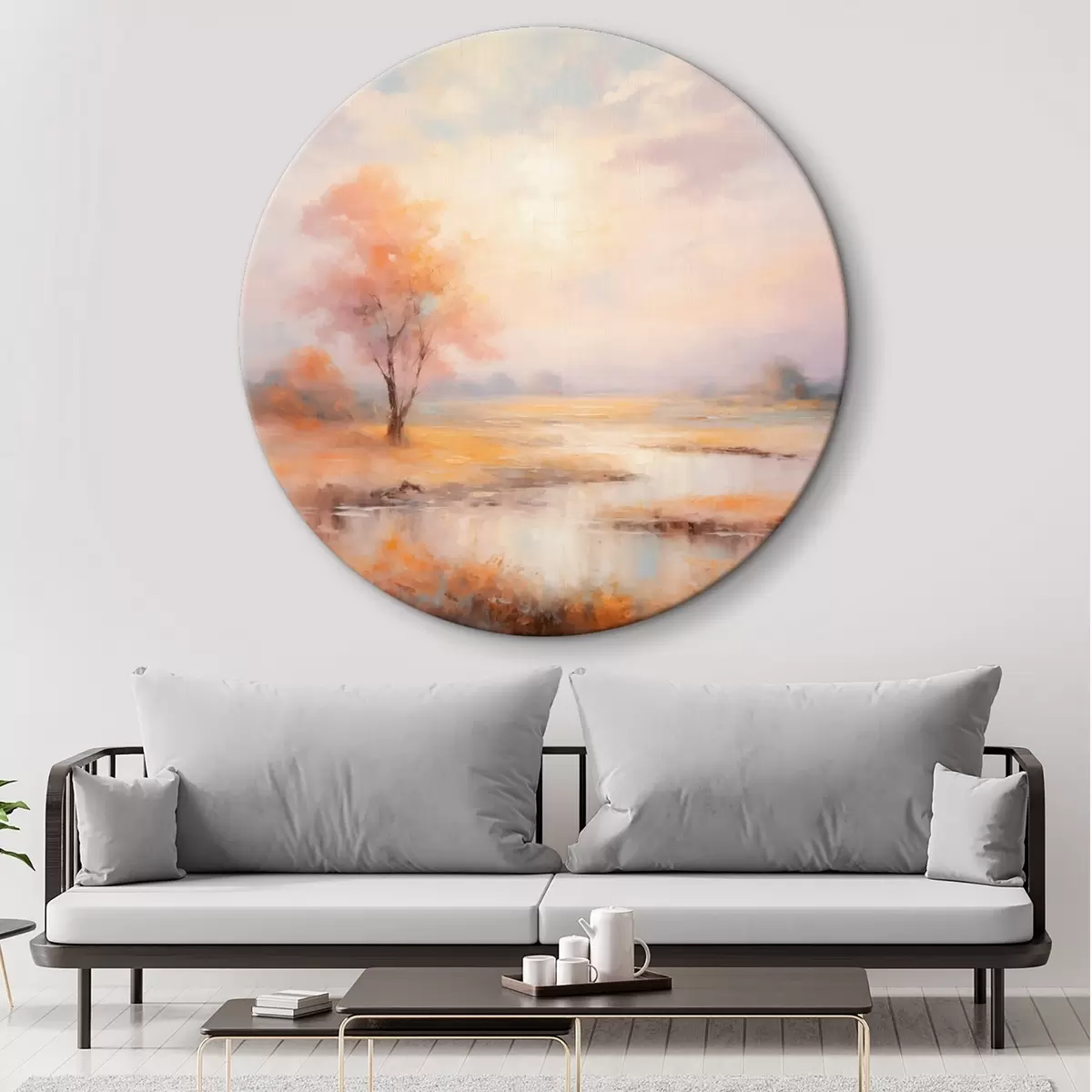 Tableaux rondes Paysage aux tons chauds avec une rivière et un arbre Nr r43375