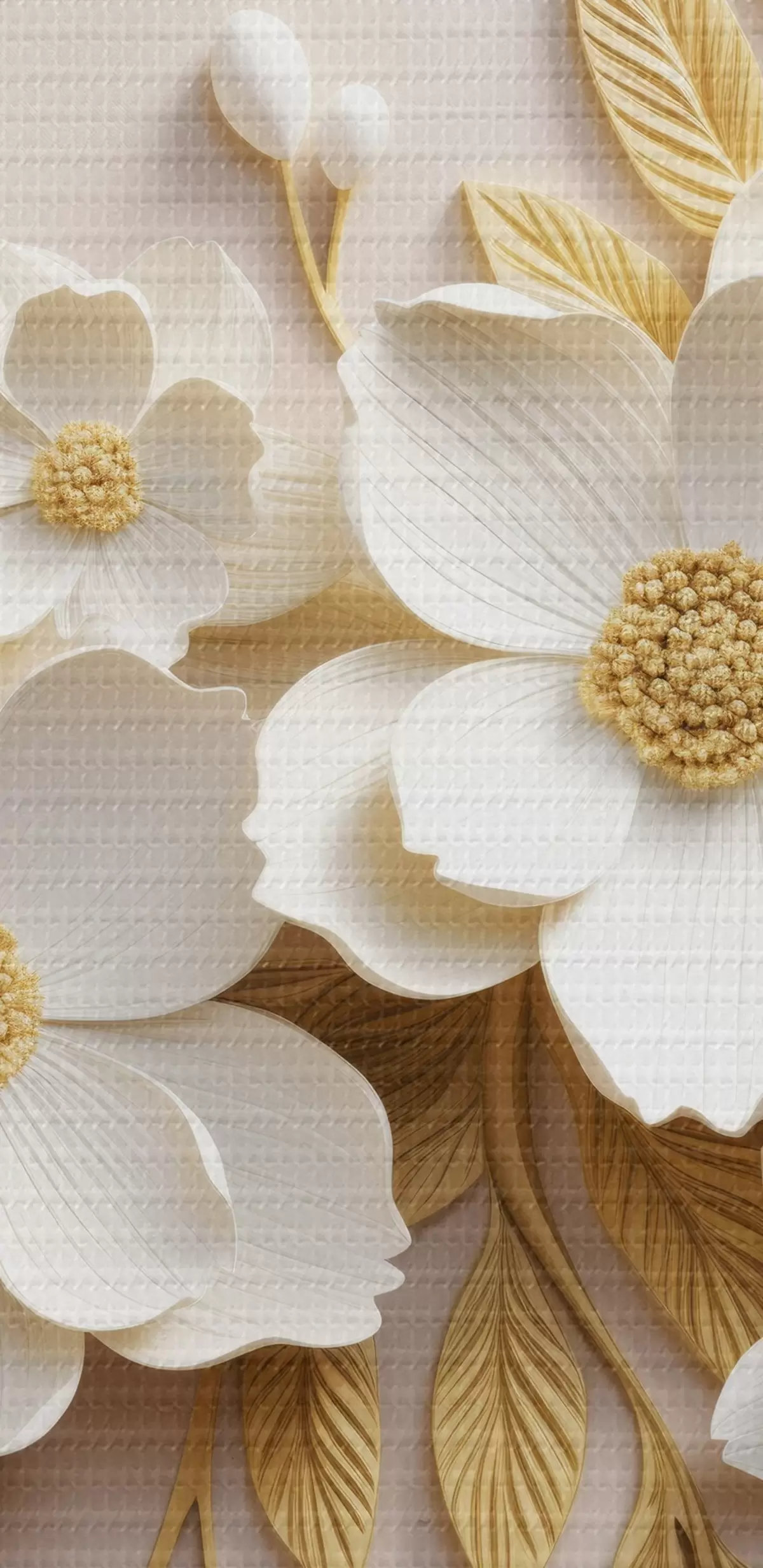 Tableaux rondes fleurs blanches en 3D avec des feuilles sur un fond crème Nr r43383